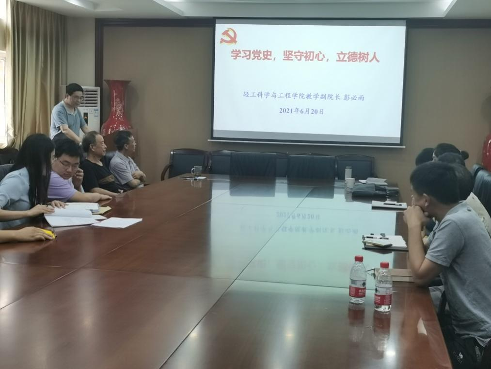 彭必雨副院长为皮革教工党支部全体党员作了《学习党史,坚守初心,立德树人》的专题党课。