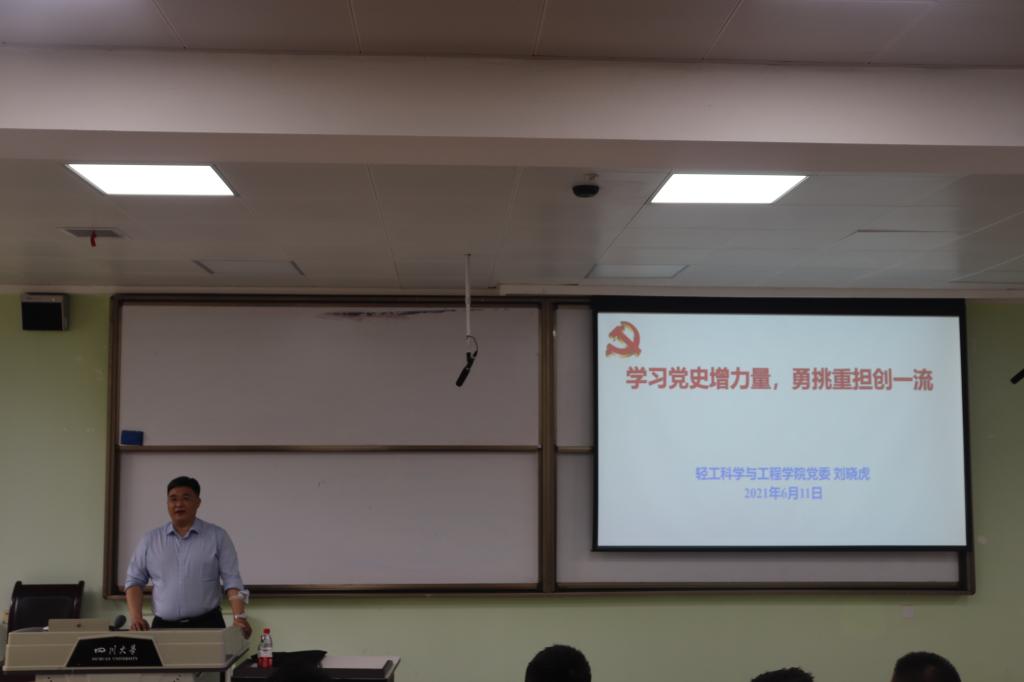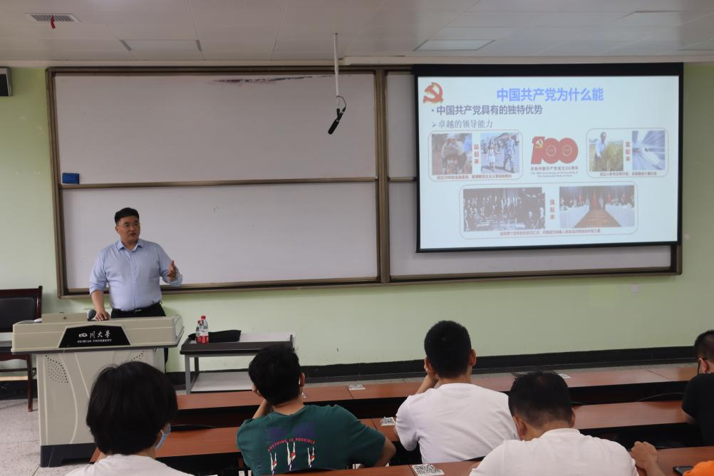 党委刘晓虎书记在四川大学江安校区第一教学楼B103教室为2020级本科生作党史学习教育专题辅导报告。本次辅导报告由2020级辅导员余昕玲老师主持。刘晓虎书记以“学习党史增力量,勇挑重担创一流”为主题,从“中国共产党为什么能”、“马克思主义为什么行”、“中国特色社会主义为什么好”、“学习党史应该获得的力量”四个部分进行重点讲授。