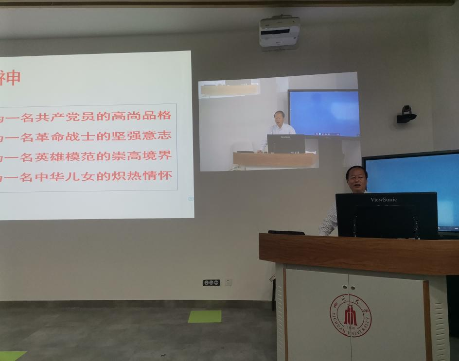 何有节院长首先以川大红色校友文化为线索,向同学们介绍了江姐和江姐精神、以及在四川大学担任过教员的革命先驱如王右木、恽代英、杨闇公、童庸生等老一辈无产阶级的先进事迹,让同学们深刻感受到校友们对党绝对忠诚的政治定力、敢于善于斗争的使命担当、功成不必在我的无私奉献精神和以天下为己任的家国情怀。