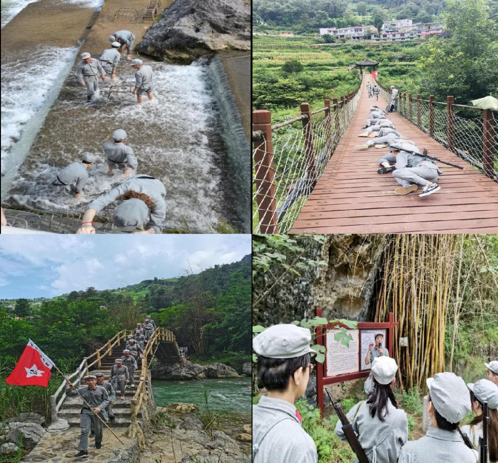 随后�实践团成�在专业人员指导下�开启了重走四渡赤水红军�重温铁血忠魂红军情的行程。实践团成员团结协作、勇往向前,最终共�完成了四渡赤水浮桥搭�、匍�渡河作战、急行军过草地、奋勇向前抢要塞等项目,真实体验红军长征渡河的艰辛和在泥泞和坎坷中一步步走向胜利的不�每到一个渡口,实践团成员认真倾听体验营专业人员关于苟坝会议、白沙会议、攻打云庄等一幕幕历史画面的生动讲述,�“实战”和“授课”中深刻领会红军长征精神,在一首首激昂的红歌声中入脑入心,坚定信念跟党走�