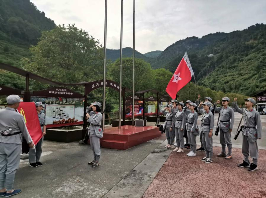 2021�7�25日上午,迎着晨风,映着朝阳,红军长征在古蔺四渡赤水画面一幕幕清晰浮现在眼前,实践团成员统一换上行军服装,李艳老师带领大家重温了入党誓词。实践团成员举起右拳在党旗下庄严宣誓�“我志愿加入中国共产党……宣誓人……”,誓词铿锵有力、初心永恒�