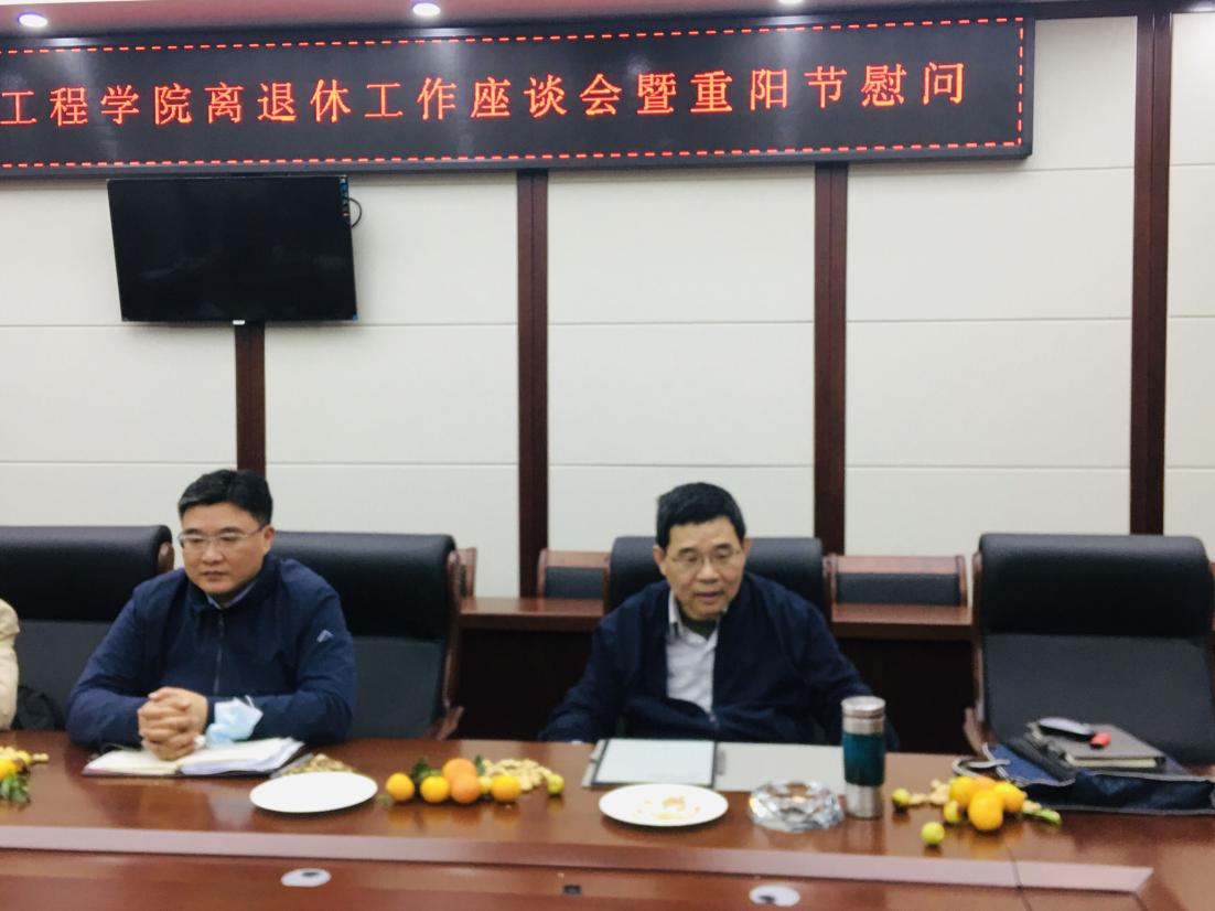 2021�10�14日,�院在纺工附楼205会议室召开离退休教职工座谈暨重阳节慰问会。刘晓虎书记、何有节院长、彭必雨副院长、何强副院长、党政办李慧主任、离退休教职工等参加本次会议。会议由刘晓虎书记主持�