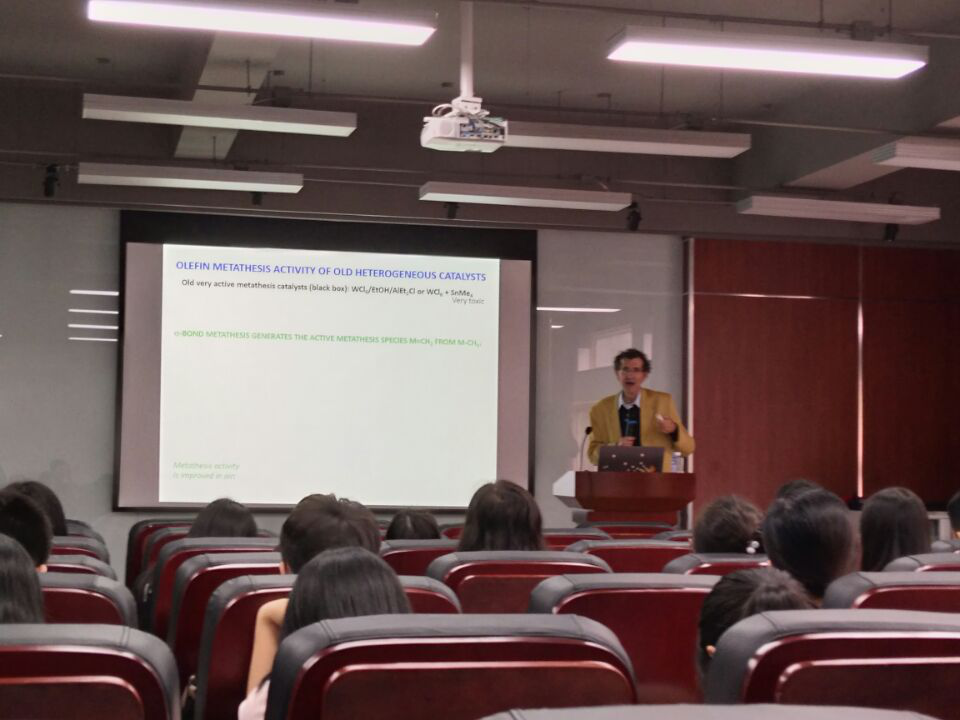 硕、博士生研究生50余人聆听了Didier Astruc教授的精彩报告。Didier Astruc教授从烯烃复分解反应(Olefin Metathesis)的历史、机理、催化剂、聚合反应以及在纳米科学和材料的应用等方面来开展讲座。Didier Astruc教授的报告幽默风趣,内容深入浅出,激起了在座老师和同学的浓厚兴趣,主持人范浩军教授带领现场同学一起做起了游戏,进一步形象生动地介绍了Didier Astruc 教授讲授的烯烃复分解反应机理。讲座期间,同学们踊跃发言提问,通过与Didier Astruc 教授面对面地交流,拓宽了8bo足球即时比分