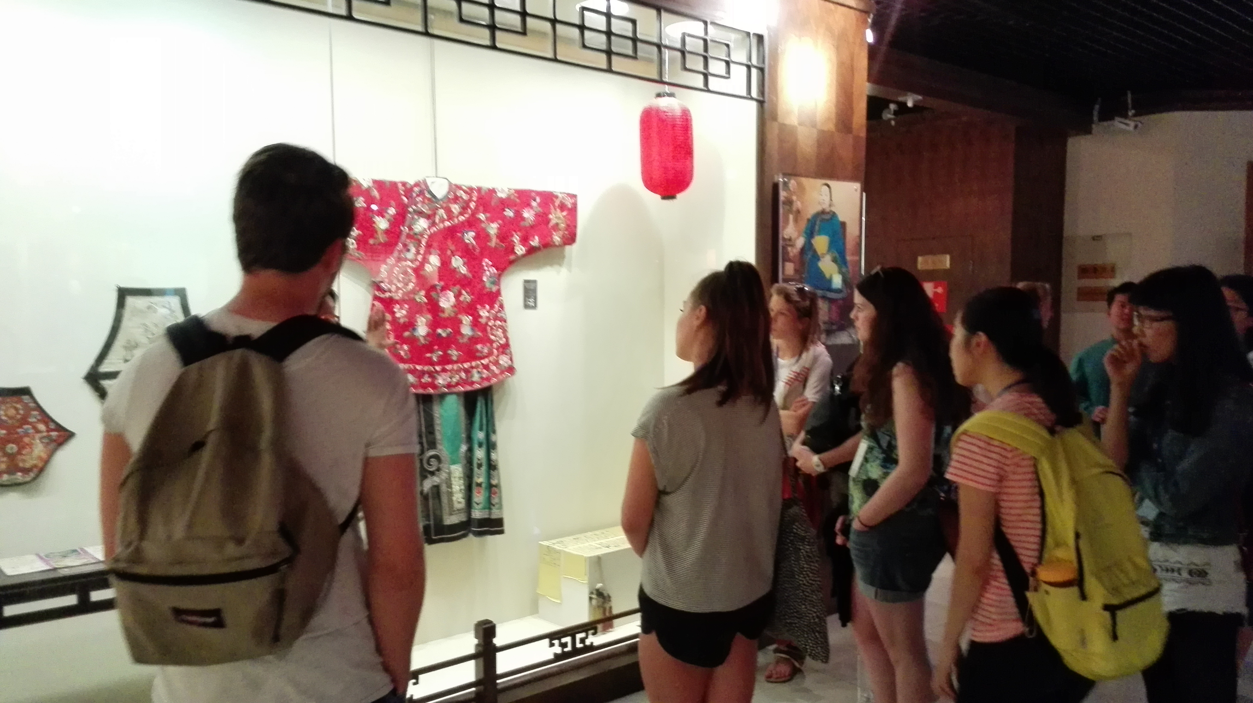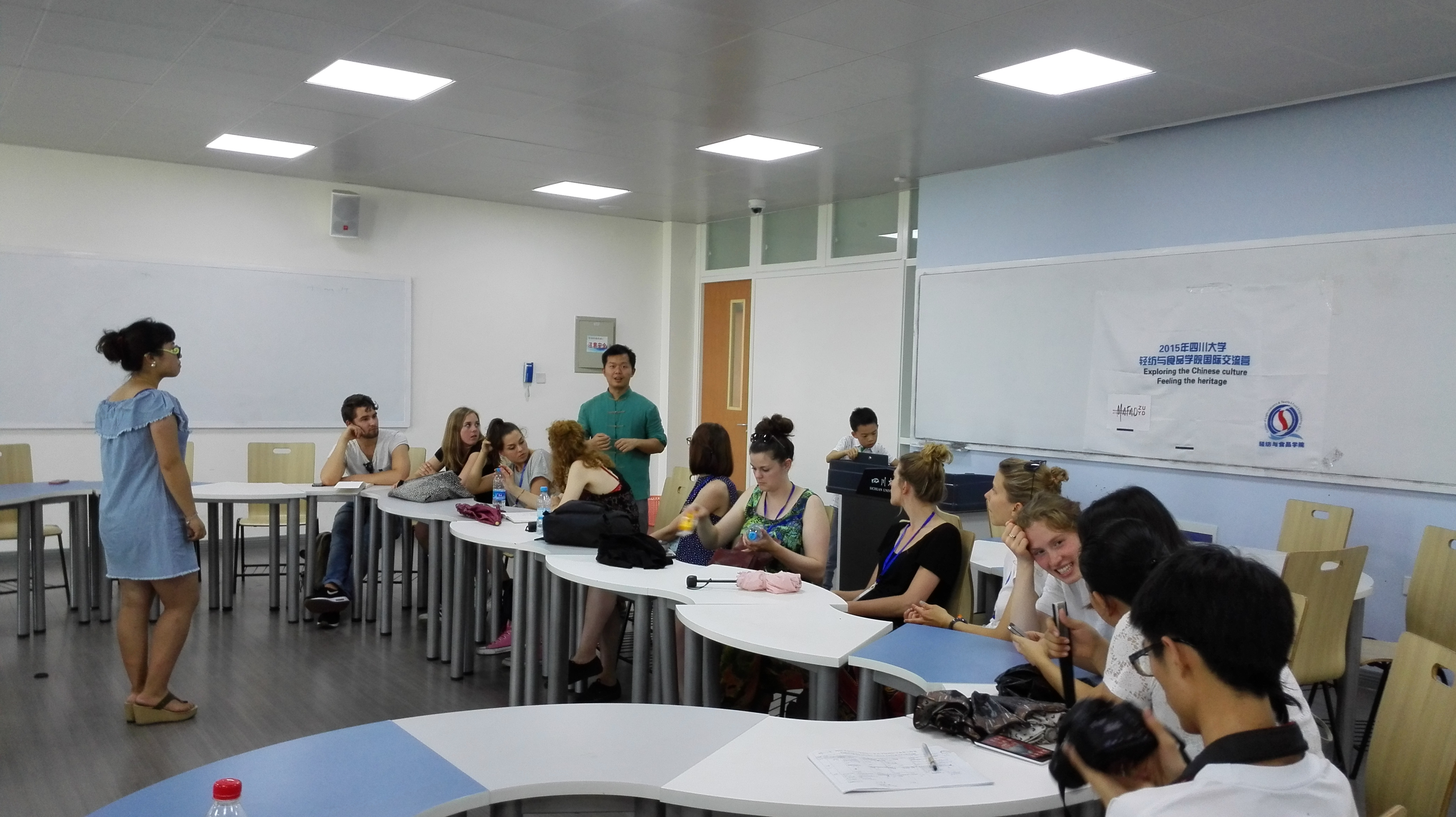 2012级和2013级的交流营志愿者同荷兰的9名同学产生了浓厚的情谊,为接下来一周的交流活动打下了良好的基础。早上9点,在祝蔚老师的带领下,交流营员从北门荷花池开始参观望江校区。途经体育馆、文化大道、张澜路、校史博物馆、东门荷塘等, 10点30分,交流营员开始参观四川大学博物馆,并对其中的展品产生了浓厚兴趣,尤其是少数民族服饰。下午13点30分,一行人抵达江安校区。首先,邀请Zuyd University的9名交流生去邮寄寄送明信片;然后交流营到达综合楼B508进行面对面的交流,并对此次交流活动的日程安排进行讲解和调整。在此次面对面交流中,双方就接下来的日程安排进行商讨并达成一致。会面中大家对上午的参观进行了深度的交流,双方在互动中产生了浓厚的情谊。
