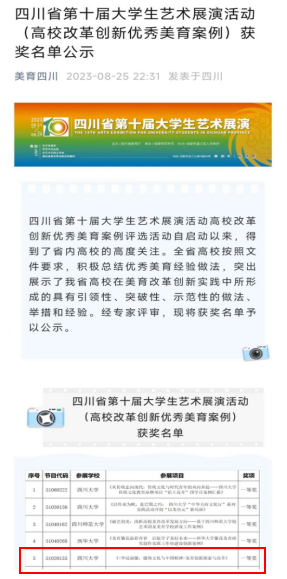 四川省第十届大学生艺术展演活动高校改革创新优秀美育案例活动于今�3月启动,自启动以来,得到了省内高校的高度关注�四川省大学生艺术展演活动代表我省大学生艺术教育的最高水平,每三年举办一次。本届大艺展由四川省教育厅主办、成都师范学院承办、温江区人民政府协办,以“厚植家国情怀,涵养进取品格”为主题,坚持立德树人,坚持面向全体,坚持弘扬中国精神�我院美育改革案例�<华冠丽服:服饰文化与中国精神>美育创新探索与改革》获本届大学生艺术展演活动(高校改革创新优秀美育案例)一等奖�