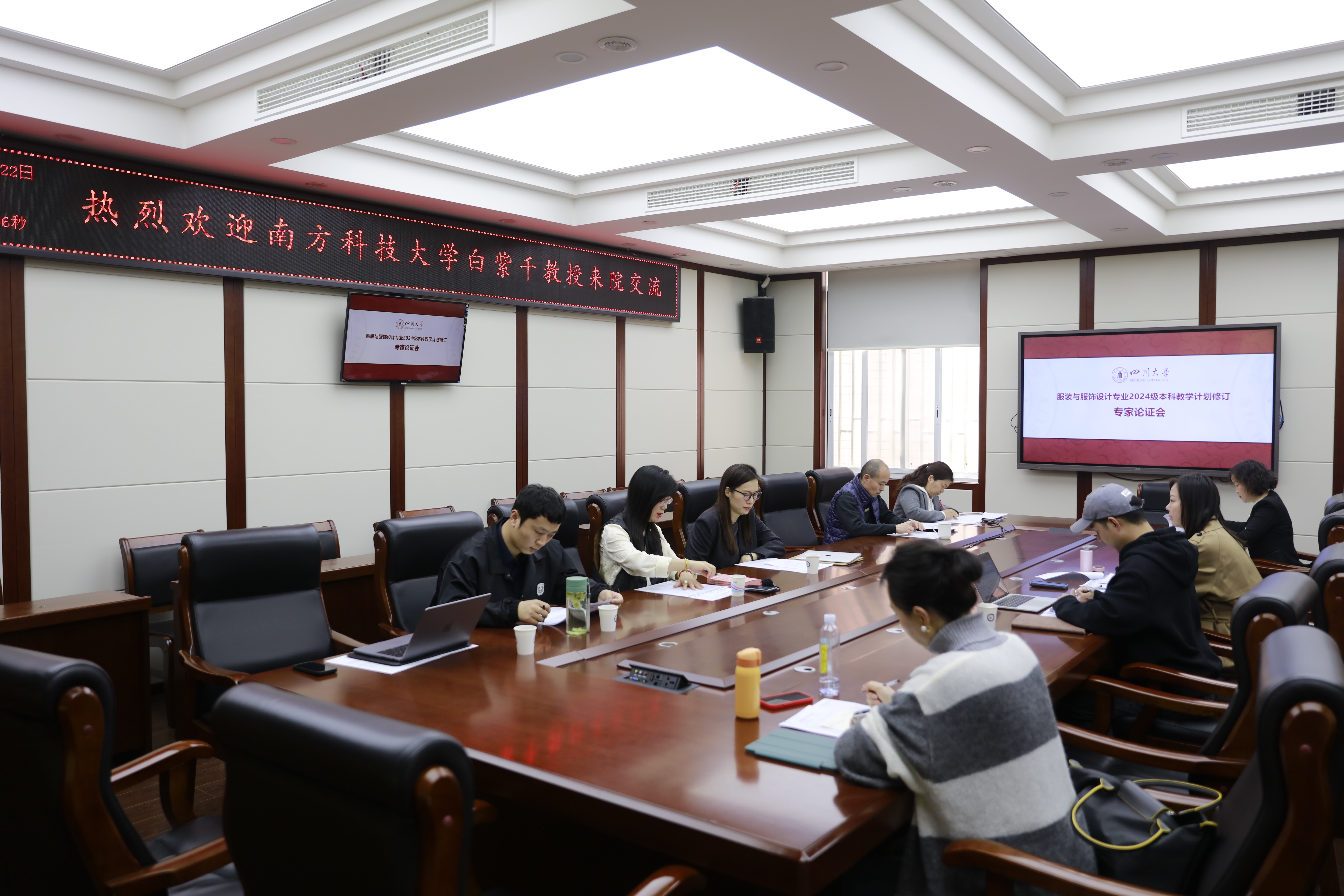 服装与服饰设计专业在四川大学望江校区纺工副楼205会议室举行了2024级本科教学计划修订专家论证会。服装与服饰设计专业教师代表参加了会议,南方科技大学助理教授白紫千老师受邀为论证专家,副系主任申鸿老师主持会议。