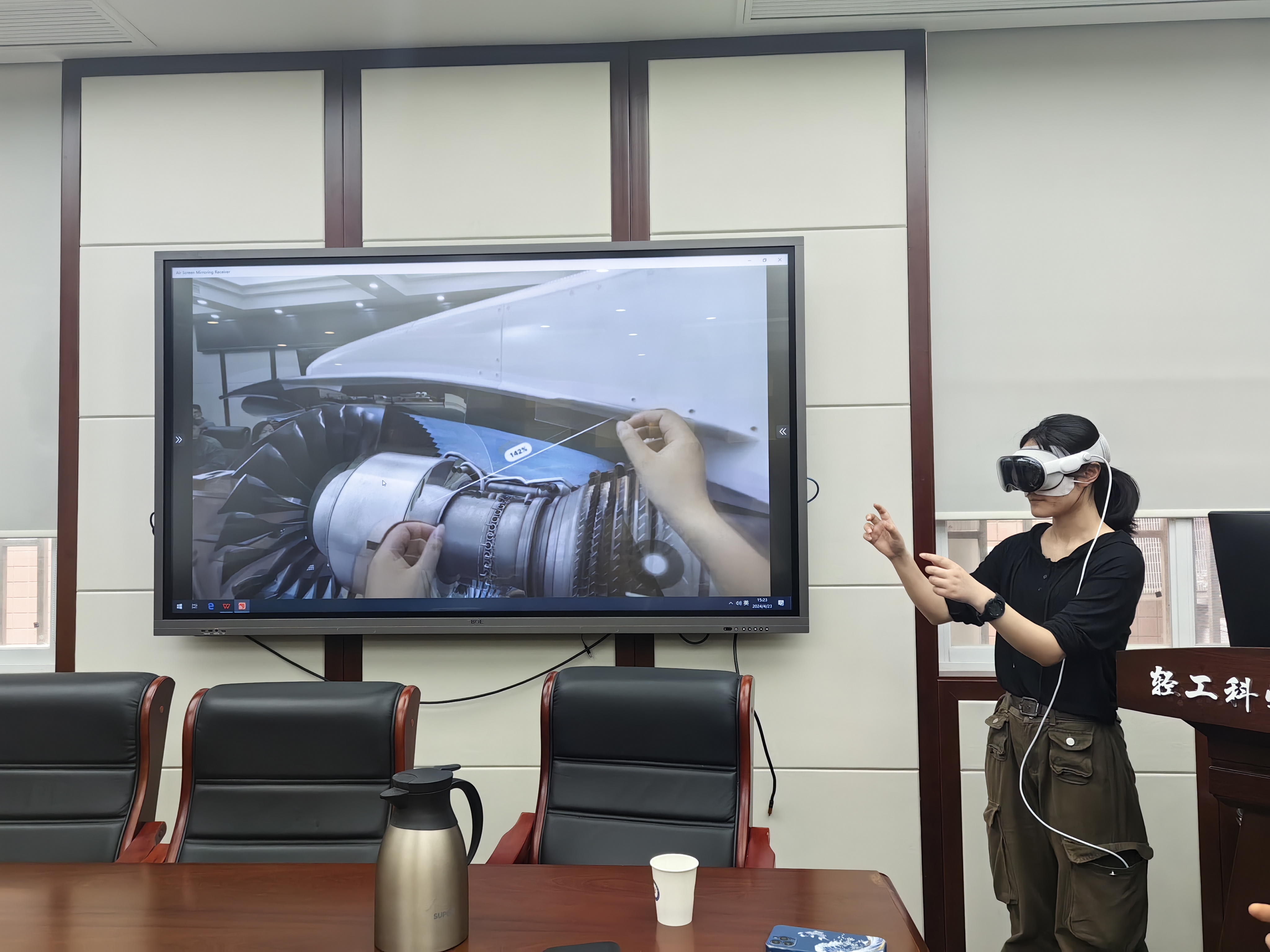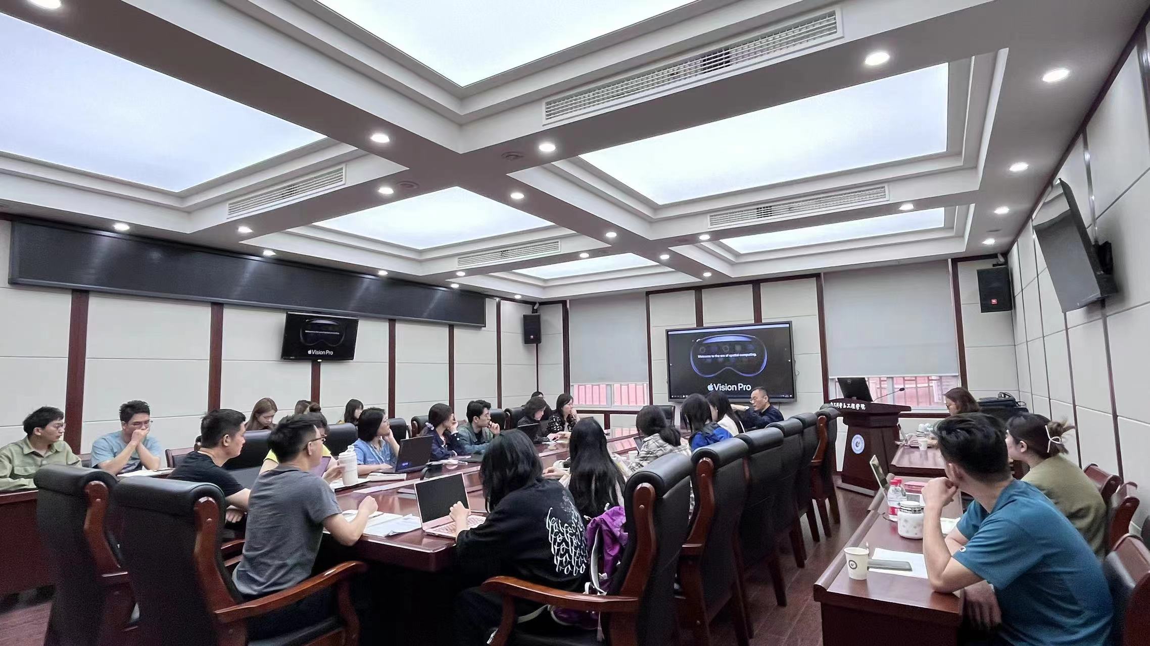 随后,来自苹果公司中国教育团队的几位资深培训专家为在场的师生们带来了精彩的内容分享与演示。他们详细介绍了苹果公司在人工智能领域的最新研发成果和应用案例,特别是空间计算设备Apple Vision Pro的功能和使用方法。为了让师生们更加深入地了解和应用空间计算设备,苹果公司和图书馆知识服务中心的专家还现场为师生们佩戴试用。师生们通过亲自试用更加直观地感受和理解了人工智能技术在实践教育中的巨大潜力。