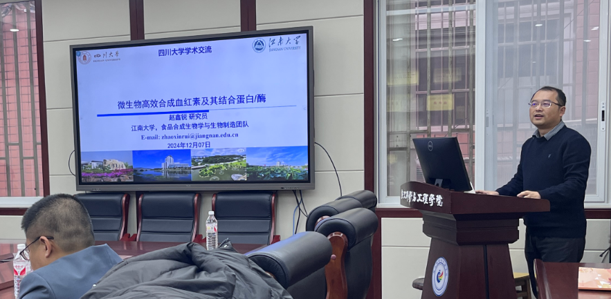 国家级é’å¹´ä¸“å®¶ã€æ±Ÿå—大学生物工程学院赵鑫é”ç ”ç©¶å‘˜ä½œé¢˜ä¸ºâ€œå¾®ç”Ÿç‰©é«˜æ•ˆåˆæˆè¡€çº¢ç´ åŠå…¶ç»“åˆè›‹ç™½â€çš„æŠ¥å‘Šã€‚血红素是一ç§å«é“的四å¡å’¯åŒ–åˆç‰©ï¼Œå¹¿æ³›å­˜åœ¨äºŽè¡€çº¢è›‹ç™½ã€è‚Œçº¢è›‹ç™½ã€è¿‡æ°§åŒ–氢酶ã€ç»†èƒžè‰²ç´ c和细胞色素P450中,并在生物体内执行许多é‡è¦çš„生ç†åŠŸèƒ½ã€‚èµµé‘«é”研究员团队通过代谢工程手段,在大肠æ†èŒå’Œé…µæ¯ç­‰å¾®ç”Ÿç‰©ä¸­æž„建了高效的血红素生产平å°ï¼Œå¹¶é€šè¿‡æ¯”较转录组学开å‘血红素生物传感器实现了血红素蛋白的高产ã€�
