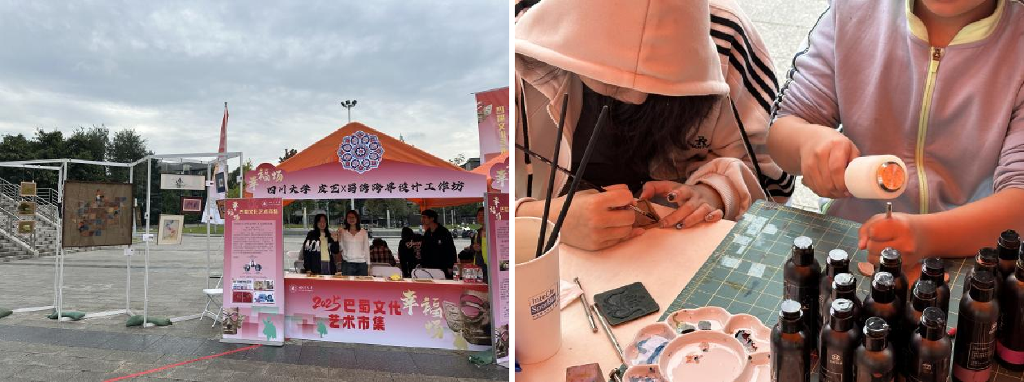 服装与服饰设计系师生组成的“皮艺×蜀绣”跨界设计工坊受邀参加由四川大学巴蜀文化传承与创新基地主办的“幸福场”巴蜀文化艺术市集。活动在四川大学望江校区体育馆举行,现场人潮涌动、氛围热烈。工坊师生带来了多件融合传统与现代美学的皮革与蜀绣跨界设计作品,吸引了众多师生与市民驻足欣赏与体验。
