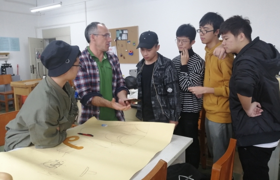 大家对朱利安背包上的亮点之“刻花”非常感兴趣,并就皮革的手工雕刻方法展开了探讨。朱利安从背包里拿出专门的制作工具和皮革样片给师生们演示了其“刻花”的制作方法。通过熟练准确的刻花落点和花型转换,朱利安现场示范了图案造型组合显示出的有序线条之美。演示之后,他请同学们也尝试在皮上刻花,感受皮革手工雕刻制作技艺的绝妙之处。通过此次观摩和试手,师生们见证并切身体会到了“非遗”传承技艺—皮革制品的手工雕刻之美。