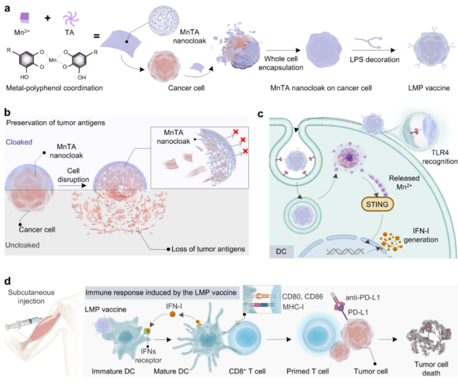 郭俊凌教授团队长期围绕植物多酚在基础科学和前沿应用领域开展研究,发展了面向跨领域应用的植物多酚基功能材料体系(Science 2018, Sci. Adv. 2021; Nat. Nanotechnol. 2016, Nat. Commun. 2022; Matter 2023; Angew. Chem. 2014, Angew. Chem. 2019, Angew. Chem. 2023, , Angew. Chem. 2024; Adv. Mater. 2013, Adv. Mater. 2020; Adv. Mater. 2023; Appl. Phys. Rev. 2022; Chem. Soc. Rev. 2022; Energy Environ. Sci. 2019; EES Catalysis 2024; Environ. Sci. Technol. 2023; ACS Nano 2023; Chem. Mater. 2023等)。近日,该团队开发了一种由金属多酚纳米涂层包裹肿瘤细胞的策略,并进一步用细菌脂多糖(LPS)进行表面修饰作为疫苗佐剂,构建了全细胞疫苗,称为LMP vaccine(图1)。研究构建了植物多酚单细胞涂层,保存了被包裹肿瘤细胞所有的新癌抗原。在被树突状细胞摄取后,LMP vaccine在树突状细胞内部释放锰离子和肿瘤抗原组分刺激先天免疫通路STING,与肿瘤抗原协同促进了树突状细胞的成熟,并进一步将肿瘤抗原信号呈递给T细胞,从而实现了增强的抗肿瘤免疫反应,抑制了肿瘤的生长。该研究成果以“Metal-Phenolic Nanocloaks on Cancer Cells Potentiate STING Pathway Activation for Synergistic Cancer Immunotherapy”为题发表于国际化学顶级期刊Angewandte Chemie International Edition,并被选为“Hot Paper”,文章的通讯作者为郭俊凌教授和何云翔副研究员(专职科研),第一作者为四川大学2020级硕士研究生和向莲。香港中文大学生物医学8bo足球比分