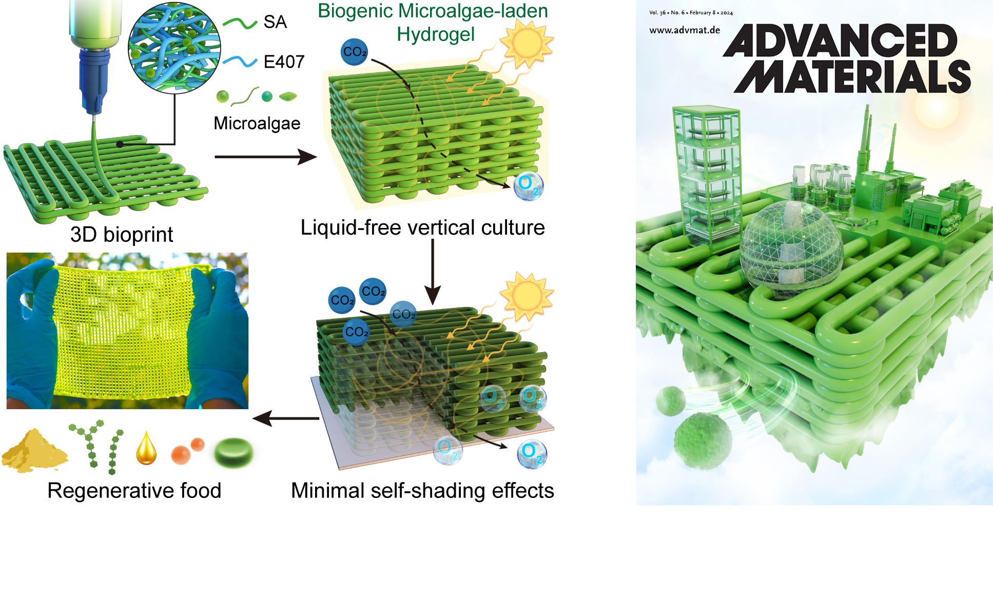 近日,8bo足球即时比分 周加境特聘研究员、林炜研究员团队与澳大利亚皇家墨尔本理工大学Joseph J Richardson教授团队合作在国际学术期刊Advanced Materials在线发表了题为“Space-Efficient 3D Microalgae Farming with Optimized Resource Utilization for Regenerative Food”的研究论文,并入选卷首插图。8bo足球即时比分 硕士研究生刘海为论文第一作者,8bo足球即时比分 周加境特聘研究员、林炜研究员和皇家墨尔本理工大学Joseph J Richardson教授为共同通讯作者,本研究还得到了高分子科学与工程8bo足球比分 肖明特聘研究员团队、8bo足球即时比分 周建飞教授以及深圳大学刘宾教授团队的协助,8bo足球比分 为该论文的第一通讯单位。