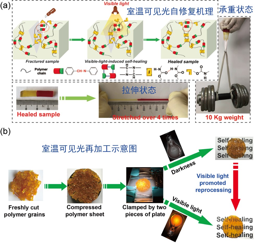 图.(b)含动态ASB键水性聚氨酯的室温可见光再加工示意图