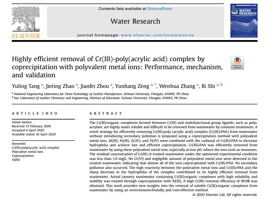 生物质与皮革工程系石碧院士课题组在由国际水协会(IWA)主办,针对全球水污染修复及水环境管理的著名学术期刊Water Research(Nature Index期刊)上发表了题为“Highly Efficient Removal of Cr(III)-poly(acrylic acid) Complex by Coprecipitation with Polyvalent Metal Ions: Performance, Mechanism, and Validation”的研究论文。论文第一作者为专职博士后唐余玲,通讯作者为曾运航副教授。