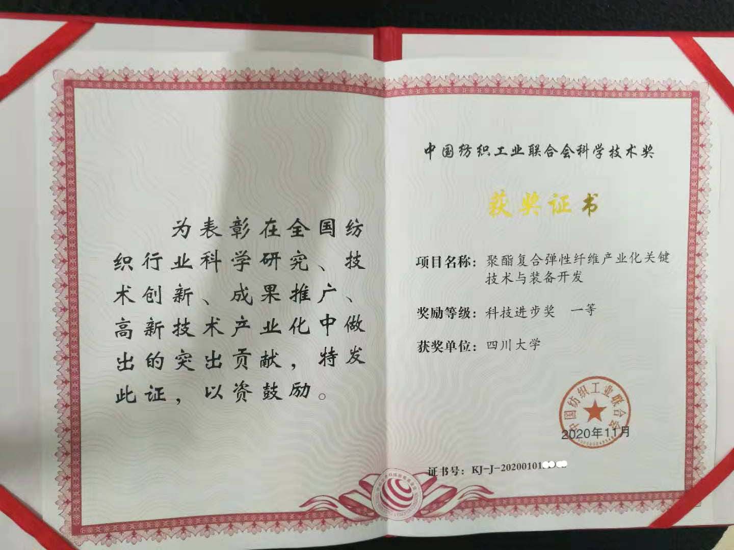 项目针对复合弹性纤维产业发展技术瓶颈,立足自主创新,在攻克新型聚酯弹性体关键合成技术,新一代聚酯复合弹性纤维高效一步法熔融纺丝关键技术基础上,实现了新一代聚酯复合弹性纤维规模化生产,形成多项原创性成果。该项目自2014年与企业开展合作,分别采用高特性粘度聚酯弹性体连续聚合生产技术建成了3万吨/年复合弹性纤维和采用高效一步法复合纺丝生产线技术建成了6万吨/年新一代聚酯复合弹性纤维,两项技术同时开辟了国内同行业生产技术先河项目被蒋士成院士任组长的鉴定委员会评价为“具有新颖性与原创性,总体技术达到国际先进水平”,对促进中国纺织行业科学技术进步和产业升级具有重要的推动作用。同时,课题组阎斌老师、林绍建老师及任二辉老师作为项目共同完成人一并获奖。
