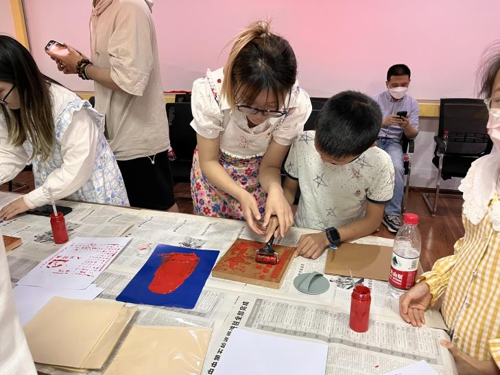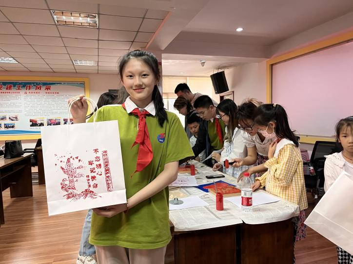 第三部分是由纺织服装研究生第二党支部的学生党员同志带领社区党员和中小学生体验非遗传统雕版印刷技艺。利用含有入党宣誓词、中国梦等党建元素的雕版,学习传统拓印技术,亲手拓印入党誓词,借助非遗技艺向党深情表白。雕版印刷是我国复制文献的传统技艺之一,支部宣传委员范雅新同志向大家介绍并演示了雕版印刷的步骤—上墨、放纸、刷印,即先在雕版上均匀涂上红色墨汁,再覆盖上一层纸,用工具有顺序地按压均匀,取拓纸,晾干……一幅鲜红的拓印画就完成了。大家认真地体验雕版印画工艺的每一个流程,并在纸袋子上动手印制了党建特色图案。这是一次传统文化与红色文化的碰撞交融,既推动了非遗文化的传承,又激活了红色文化新活力,弘扬了中国红色文化,传播正能量�
