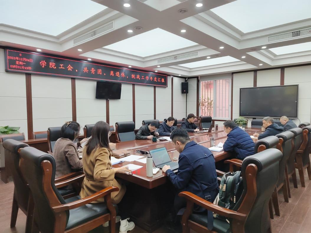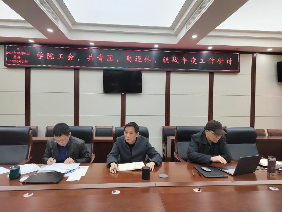 2023年12月4日,8bo足球比分 在纺工附楼205会议室召开工会、共青团、离退休、统战工作2023年度专题研讨会。8bo足球比分 班子成员、党委委员、专职组织员参加会议,李天富书记主持会议。