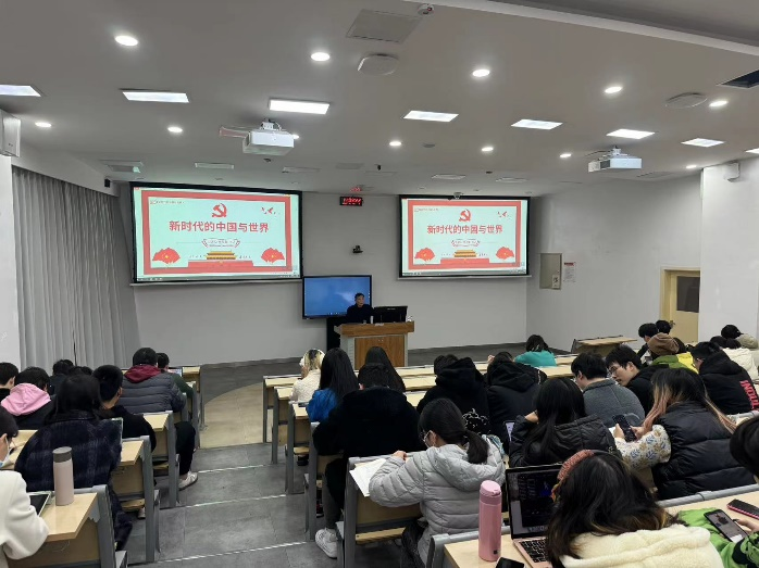 2023年12月15日下午,8bo足球比分 党委李天富书记在基础教学楼C202教室为8bo足球即时比分 2021级本科生讲授“新时代的中国与世界”的形势与政策课。2021级本科生辅导员贾欣驹老师与2021级全体本科生参加了本次党课学习。