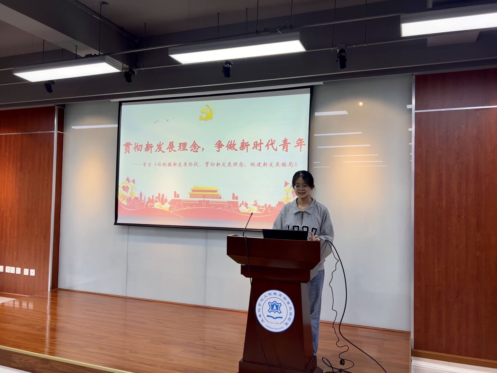 “三个一流”创建活动相关工作,深入学习《论把握新发展阶段,贯彻新发展理念,构建新发展格局》,全面贯彻新时代中国特色社会主义思想。2024年4月11日,皮革研究生第一党支部在皮革楼215开展了“贯彻新发展理念,争做新时代青年”的主题党课。本次党课由罗玲娟同志主讲。
