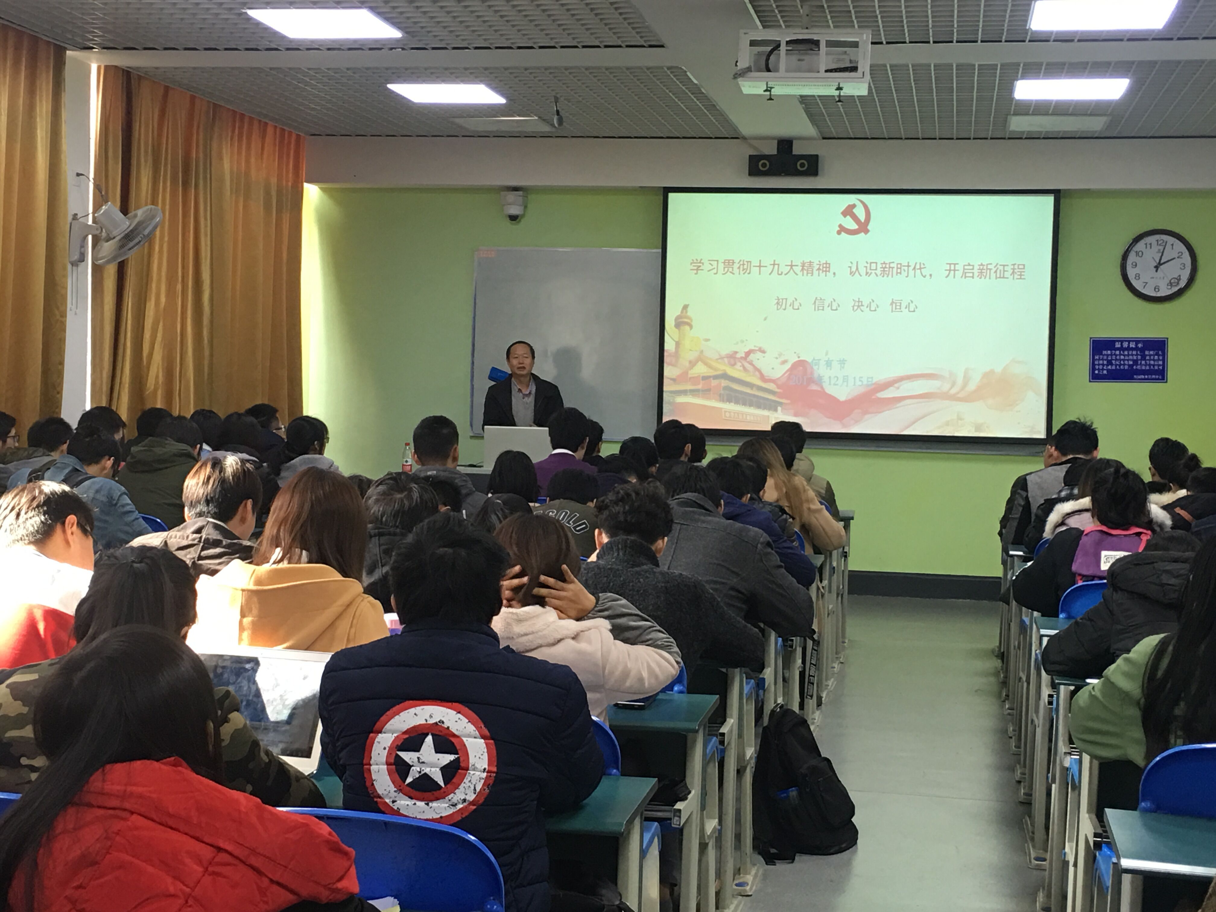 院长何有节教授深入2015级本科生形势与政策课课堂,为2015级同学做了“学习贯彻十九大精神,认识新时代,开启新征程—初心、信心、决心、恒心”为题的专题讲座。辅导员贺婷老师及2015级轻化工程专业、食品科学与工程专业、生物工程(轻工生物技术方向)专业同学聆听了讲座。