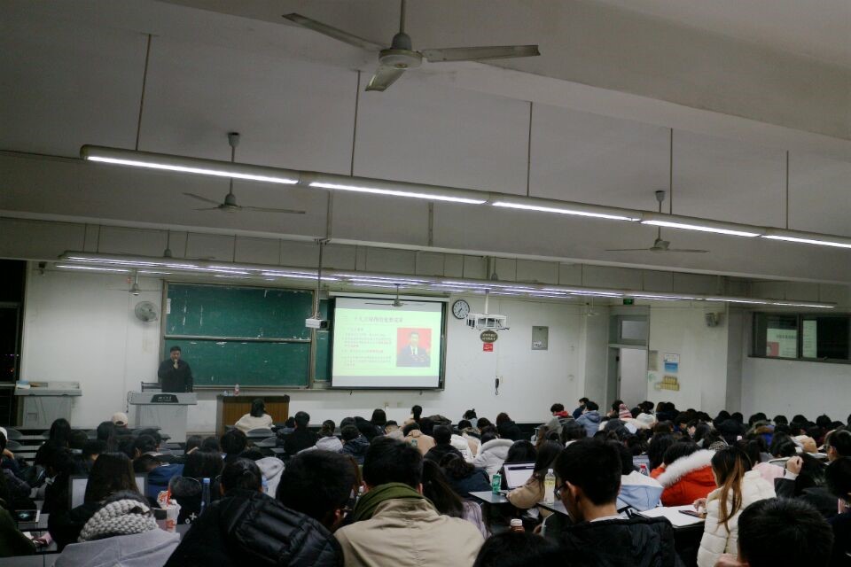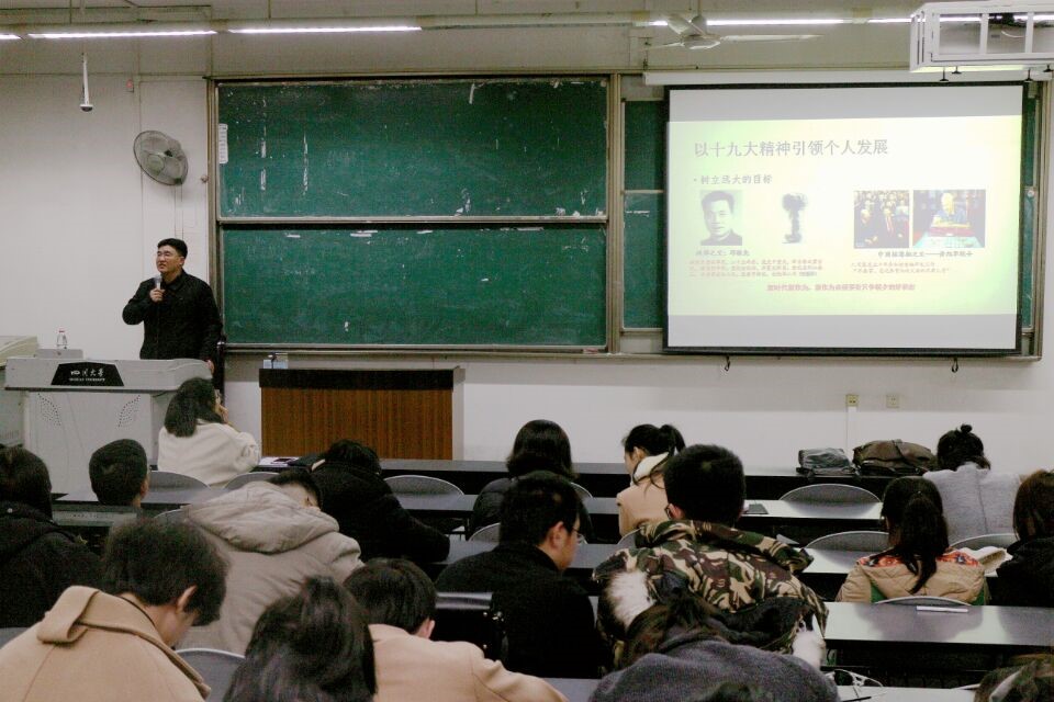 党委书记刘晓虎副教授深入2016级本科生形势与政策课课堂,为2016级全体同学做了“以党的十九大精神引领全面发展—新时代、新状态、新境界、新作为”为题的专题讲座。辅导员王舒灏老师及2016级全体学生聆听了讲座。