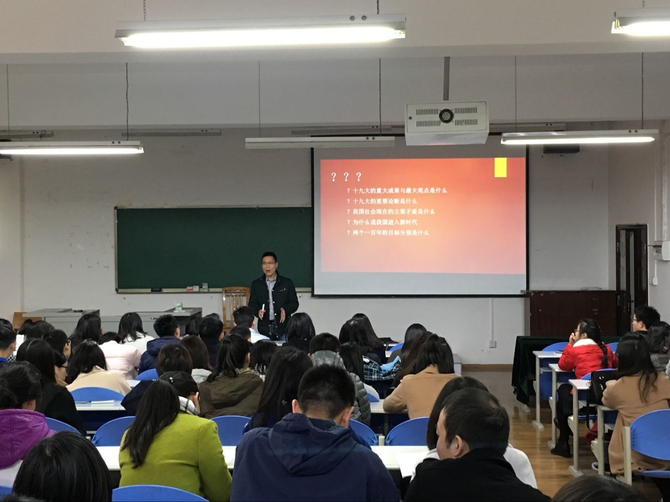 各党支部、各团学组织、各社团、各班级的活动开展。在“讲十九大”活动方案中,各党支部至少要做到“领导讲、专家讲、支委讲、党员讲”相结合,各不同角色、不同方向、不同层次加深对十九的学习体会,本次专题报告便是讲十九大学习活动之一。其次,冯国涛副书记以“十九大的重大成果与最大亮点是什么?十九大的重要论断是什么?我国社会现在的主要矛盾是什么?为什么说我国进入新时代?两个一百年的目标分别是什么?”等一系列问题以讨论的形式与在座同学互动交流,了解党员同学对十九大精神主要内容的认知与掌握程度,并以此问题展开深入的讲解。在场同学们对此展开了热烈的讨论与交流。接下来,冯国涛副书记从新时代的五个定位、八个明确、十四项基本方略对我国社会主义进入新时代进行了详细的阐述;对新青年有理想、有本领、有担当的要求进行了深入剖析;对新党章修正案要点进行了简要解析;最后对在座研究生在明确两个一百年目标的时代背景下,如何做好自我规划、练好本领,时刻为社会主义现代化强国而努力奋斗作出新青年的贡献提出了建议与要求。