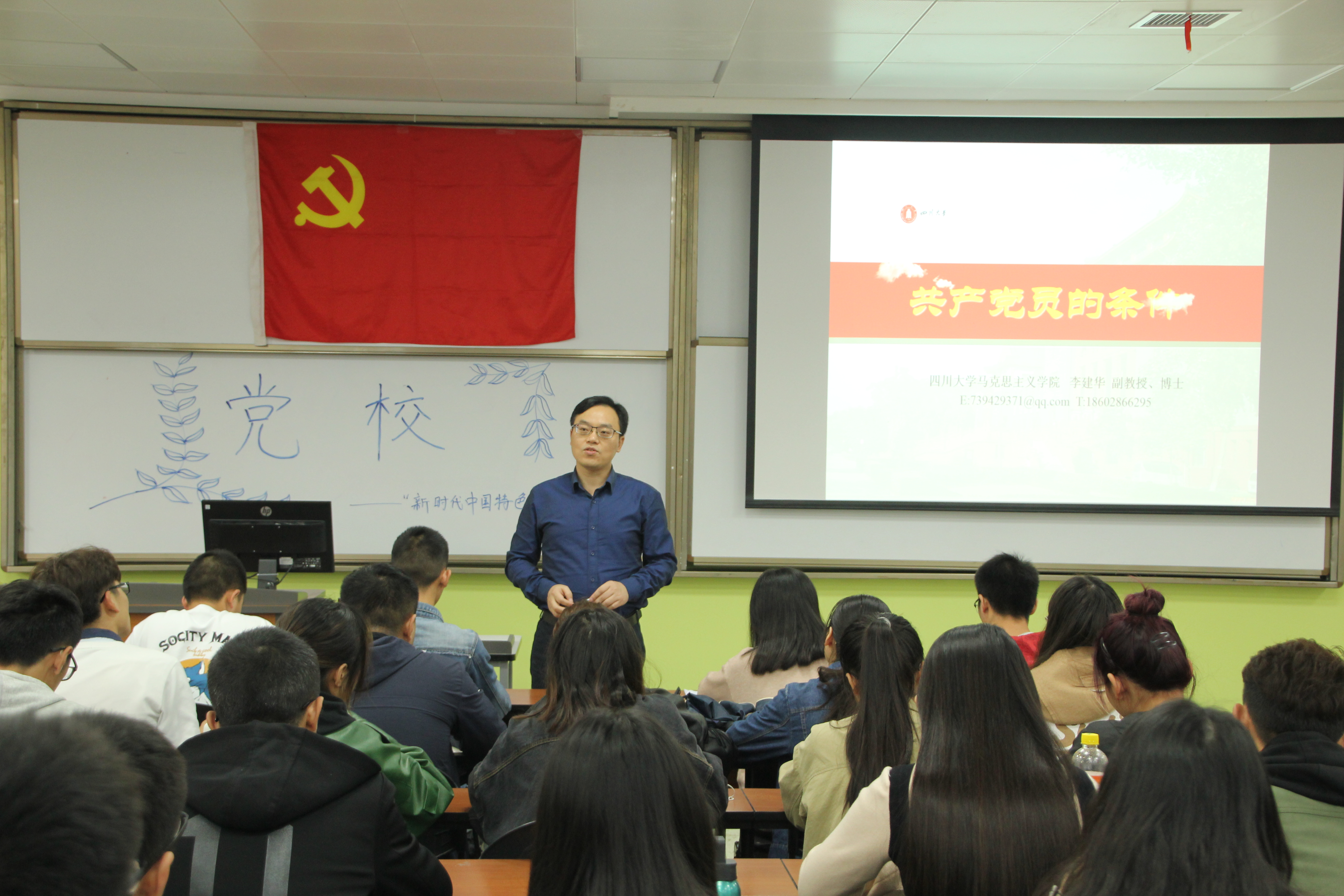 2018�10�21日下�15�00,四川大学党校第145期学生党员发展对象培训班第三讲在江安校区第一教学�B�107教室顺利举行。本次授课人为四川大学马克思主义学院李健华副教授。李院长从入党的条件、优秀党员的要求、党员的权利和义务以及大学生党员的基本要求四个方面,详细地为同学们介绍了如何成为一名优秀的大学生党员�