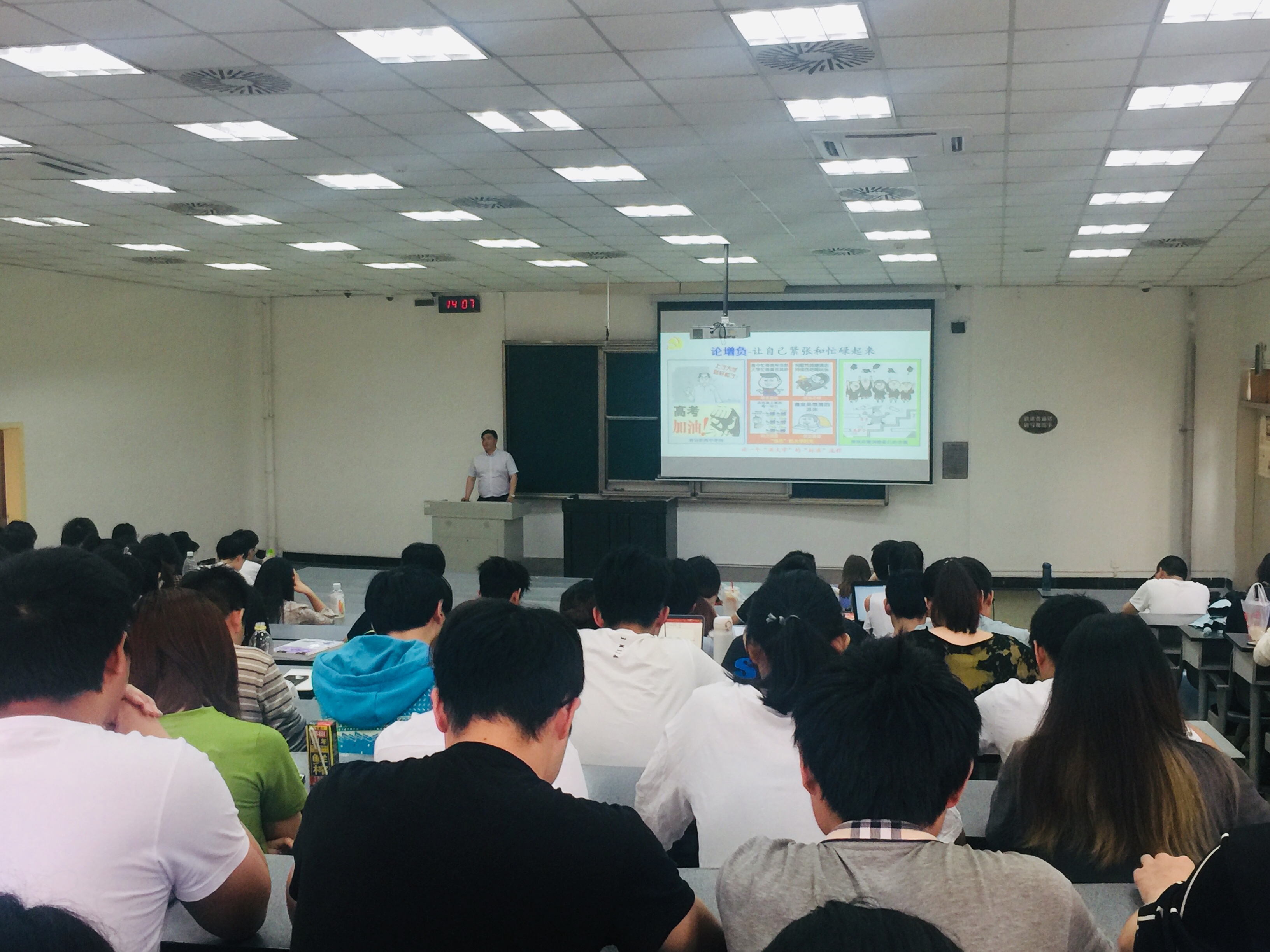 党委书记刘晓虎副教授深入2016级本科生形势与政策课课堂,为2016级全体同学做了以“为未来跑赢接力赛全面准备”的主题形势报告会。辅导员王舒灏老师及2016级全体本科生听取了报告。