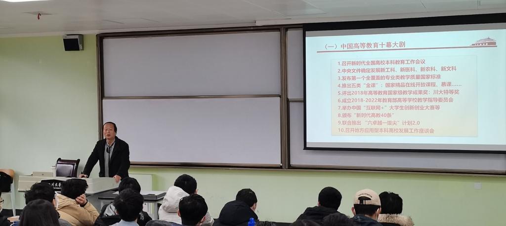 随后,在第二部分的新时代教育中,何有节院长通过中国高等教育的十幕大剧展示中国高等教育规模与教育实力的巨大变化,指出中国本科教育进入了新时代,以新科技革命与产业的具体变革结合五中全会关键词,指出高等教育的新成就、新目标、新要求及新动力,点明当今高等教育狠抓本科教育质量的新变化五个方面向同学们展示了建设高等教育强国,赢得本科教育新时代的重大使命。