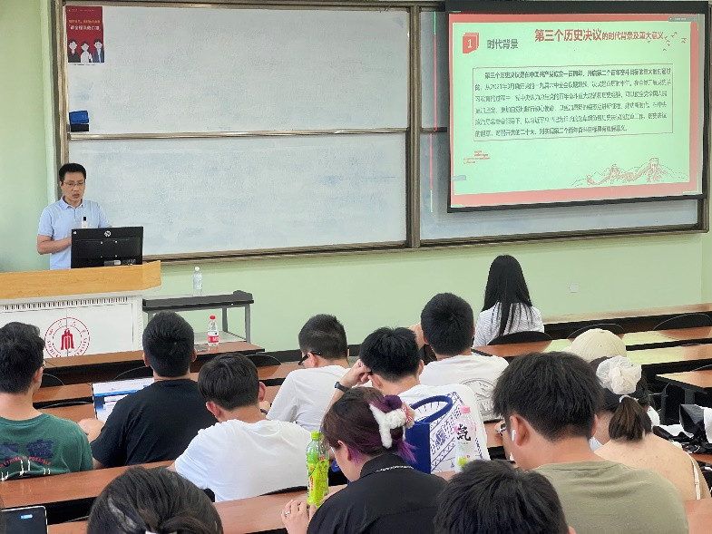 党委冯国涛副书记向本科生第三党支部讲授了“学深悟透三个历史决议,争当时代新人”的主题党课。