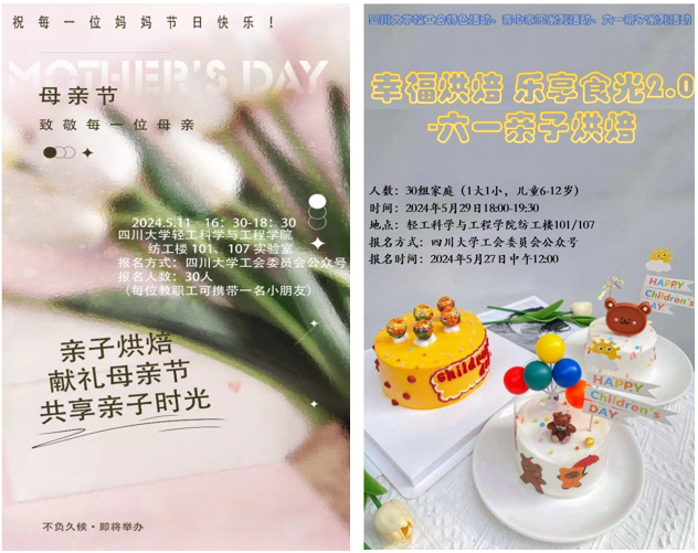 不负久候,如期而至。8bo足球比分 分工会主办的“幸福烘焙 乐享食光”2.0活动终于在2024年5月,又与大家见面了。此次活动共举办了两场,分别是5月11日的“献礼母亲节 共享亲子时光”和5月29日的“六一亲子烘焙”,两场活动均由8bo足球比分 分工会副主席、食品科学与工程专业老师董怡副研究员带领食品专业学生助教现场指导,确保了食品的安全性以及活动的顺利开展。