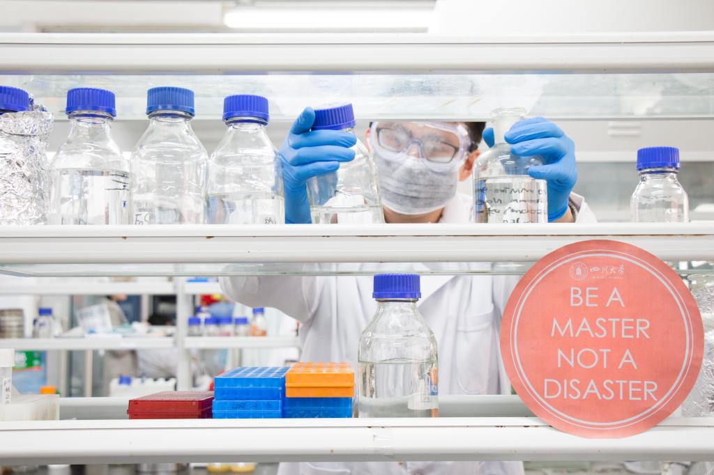 无论是细小的整理操作,还是不得有半点闪失的实验过程,都需要把实验室安全放在第一位。本系列摄影捕捉了一些实验室中的日常景象,突出了川大标识色的标语,意图通过规范的实验操作和完备的防护措施来体现实验室安全的重要性。