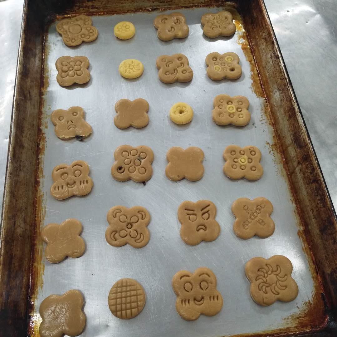下午14:00,工作人员将所有购置原材料清点分选完毕。待25名参加人员到场签到完毕,随即分为四个小组开始制作。首先由工作人员讲解曲奇制作步骤并分发实验手册,将黄油在室温下进行软化,加入糖粉,用电动搅拌器混合均匀,分次加入蛋液打发,低筋粉、奶粉混合,筛入奶油中。混合均匀即可通过模具挤压制作曲奇,于烤箱内烘烤适当时间即可得到成品。在经历了和面、压制成型和烤制等操作后,曲奇饼干制作完成,造型独特,风味也得到大家一致好评。