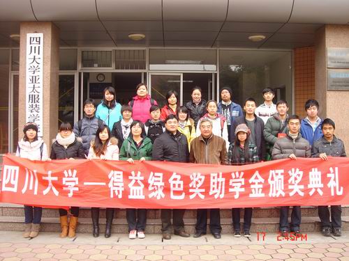 对四川得益绿色食品集团有限公司客人在百忙之中参加本次颁奖典礼表示热烈欢迎,对公司在我校设立奖助学金表示忠心的感谢,对全体获奖同学表示诚挚的祝贺。同时,刘书记还介绍了四川得益绿色食品集团有限公司的基本情况,尤其是得益绿色公司所倡导的经营理念:“作食品就是作良心”,体现了贵公司把食品安全与消费者权益放在首位,更加体现了企业的社会责任感。也希望获奖同学不辜负设奖单位的期望,学好技术,增长才能,为报效祖国、回报行业作出楷模。随后,孟总代表杜成斌总经理对四川大学的热烈欢迎表示感谢,对所有获奖同学表示祝贺。希望同学们在校期间努力学好能领,以优异的成绩与良好的技能来回报社会、回报行业以及回报母校。2009级硕士研究生马丽莉同学代表所有获奖同学作了发言,她非常感谢贵公司给予的支助,让更多的同学在寒冷的冬天感受到了浓浓的暖意,更加感谢学校领导与老师在培养过程中给予的指导和帮助。整个颁奖典礼在一片愉乐的氛围中结束。