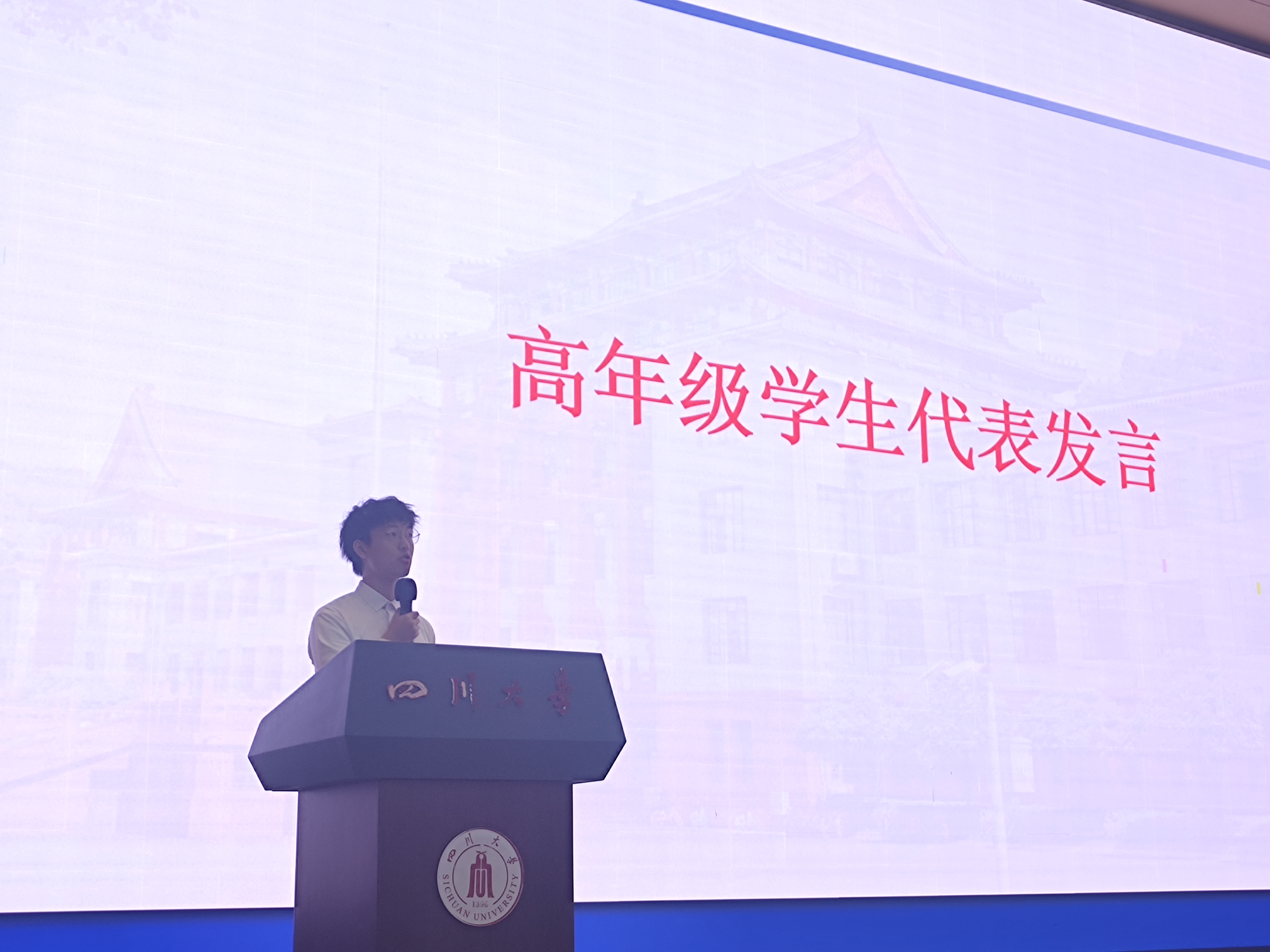 2021级生物工程专业陶思恒同学作为高年级学生代表发言。陶思恒同学�2023级新同学的到来表达最热烈欢迎并分享交流大学学习生活感受。谈到如何充分利用大学四年时间,陶思恒同学建议学弟学妹们实事求是、脚踏实地,志存高远,专注于做好当下眼前的事情,让理想主义的花最终盛开在浪漫主义的土壤里�
