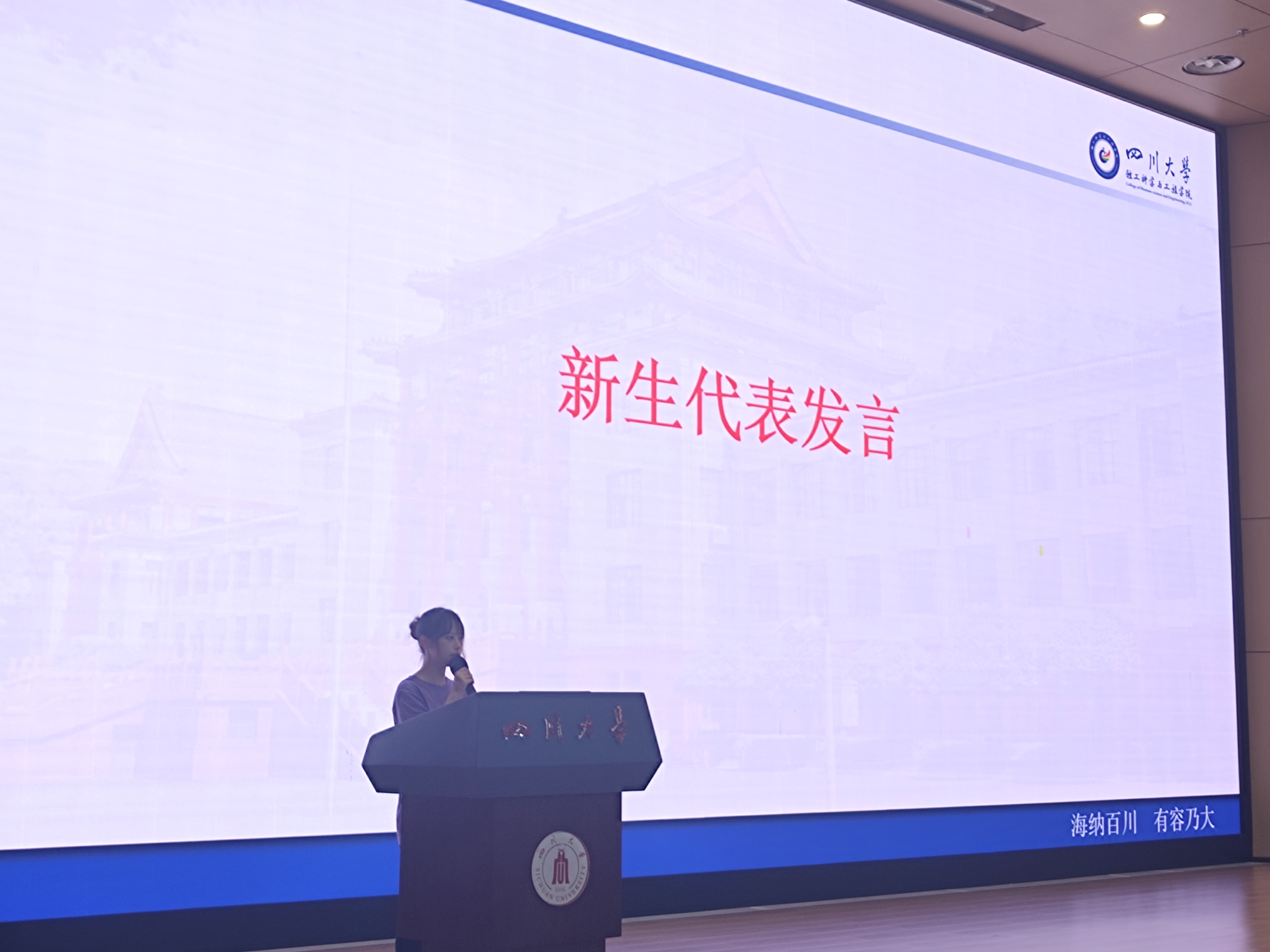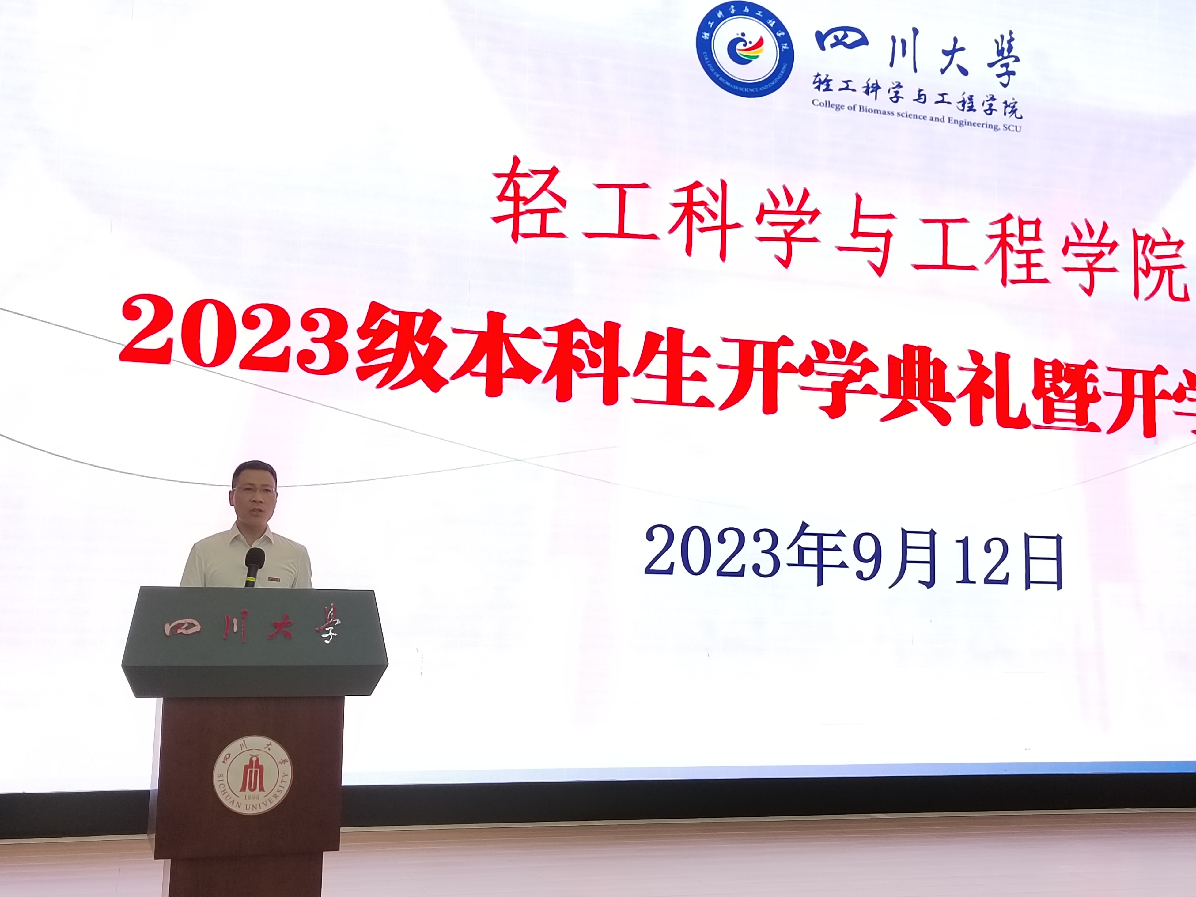 2023�9�12日上午,轻工科学与工程学�2023级本科生开学典礼在江安校区水上报告厅顺利举行,出席开学典礼有轻工科学与工程学院院长彭必雨教授,副院长陈意教授、周建飞教授�2023级教导员吕振生老师,生物质与皮革工程系系主任林炜教授,服装与服饰设计系系主任杨璐铭教授、副主任申鸿副教授,食品工程教研室主任段飞霞副教授,还有国家级高层次人才代表周加境特聘研究员,教师代表金垚副教授以及2023 级全体新生。开学典礼由学院党委冯国涛副书记主持�