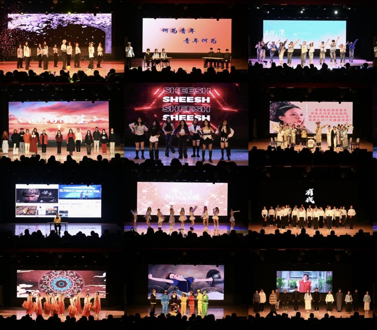 晚会分为“初梦扬帆起航”、“筑梦乘风破浪”、“圆梦共庆华章”三个篇章,节目内容贴合青年特点,充满激情活力,紧扣时代脉络。通过歌舞、合唱、话剧、小品等多种形式,展现了积极向上的精神风貌和开拓进取的青年姿态,表达出对大学生活的美好期待和青春意义的深切思考。小品《时间都去哪了》以幽默诙谐的方式引发同学们对时间管理的深思;舞蹈《九州同》以优雅大气的舞姿展现国家的繁荣昌盛和盛世太平;情景剧《白雪公主与七个高大个》在创新中融入网络流行元素,为观众带来全新的视听体验;舞蹈《sheesh》+《Live》、《等着你回答》等节目伴随着极具节奏的旋律,展现青春活力;合唱《有我》、《向阳而生》以恢弘的气势和激昂的歌声,奏响时代强音;小品《甄嬛外传》以校园外卖失窃为背景,倡导同学们坚守道德底线;舞台剧《说75》回顾了建党75周年的光辉历程,彰显青年的使命担当;《民族大融合》以精彩的演绎展现出各民族的独特魅力及和谐共处的美好景象;研究生带来的歌曲则表达了对未来的美好祝愿。形式多样、精彩纷呈的节目引得现场掌声不绝于耳。