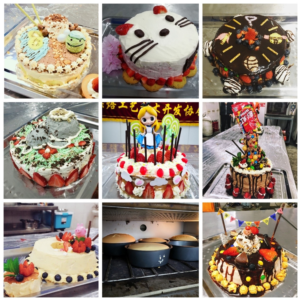 下午13:00,八组参赛同学开始制作蛋糕,同学们根据现场学习到的方法和自己以往的制作经验,有条不紊的制作自己的戚风蛋糕作品,现场井然有序。伴随着满屋香气,下午16:30,八组同学的戚风蛋糕坯全部制作完毕并开始蛋糕的裱花和装饰。同学们依据计划书的作品设计图,将奶油调和成不同颜色,放置不同水果、饼干、小饰品做装饰,很好的表达了自己的设计初衷并契合了此次比赛的主题-“畅享DIY-解锁你的二次元”。