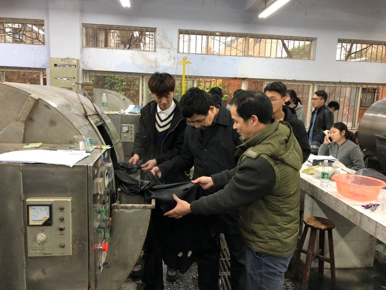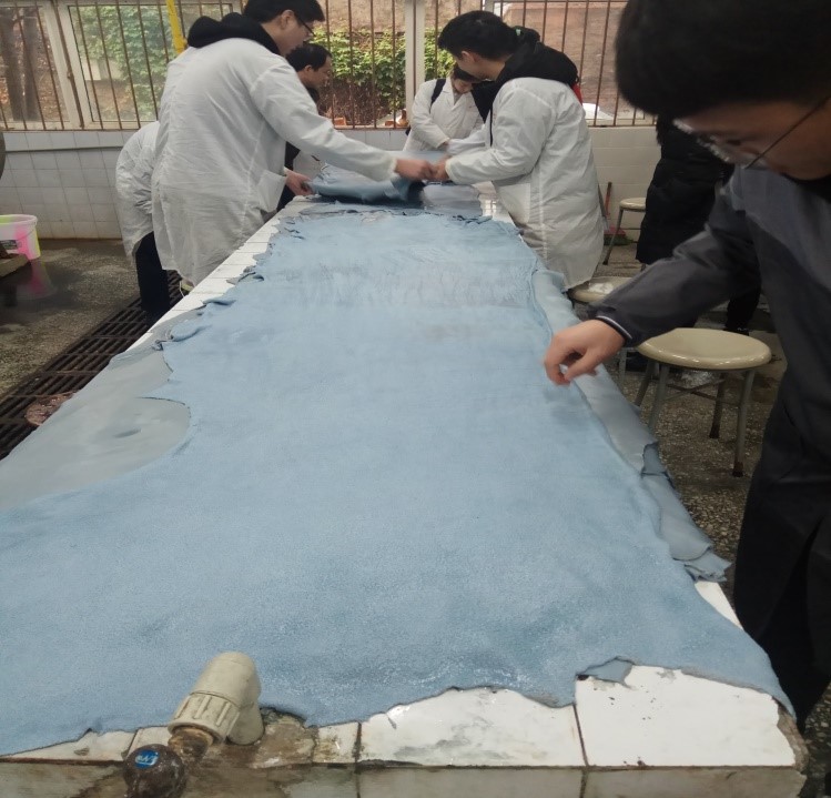 生物质与皮革工程系组织的轻化工程专业2015级本科生皮革生产实习湿加工工段于2017年12月26日在望江校区皮革楼工艺试验室顺利完成。湿加工工段历时两周,包括脱毛浸灰,浸酸鞣制,复鞣填充,染色加脂等关键工序,实习由程海明、周建飞、陈敏、曾运航四位老师及助教张金伟博士指导进行,另有张长春和税科林老师为生产设备和化工材料提供保障。