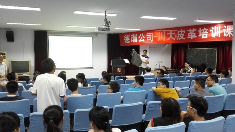 向德瑞公司代表团的到访表示热烈的欢迎,他回顾了德瑞公司与川大皮革系的深厚友谊及在人才培养、技术开发方面的合作历程,重点介绍了德瑞公司在皮革环境友好材料开发应用方面所取得的成就,勉励参与课程的同学能在课程和联谊活动中珍惜难得的机会与德瑞公司代表团成员们积极互动。 德瑞公司销售副总裁徐怀海先生对德瑞公司以及皮革行业做了详细的介绍,强调了皮革行业的发展前景如何有节院长所说的“日不落产业”,认为德瑞的重心在于解决皮革行业所面临的现实问题。随后,德瑞公司技术总监周利军校友、高级技术代表何杰校友以“现代制革业的破局——时尚/环保与传统工艺的融合”为题,对德瑞公司在水场准备工段的解决方案做了详细的介绍,并与现场同学进行了热烈深入的交流互动。培训课程第一单元结束后,参与培训课程的师生利用茶歇时间在皮革楼209会议室参加了德瑞公司最新时尚皮革品种路演活动,并与德瑞代表团成员就感兴趣的皮革品种的制作工艺以及皮革化工材料使用情况进行了热烈的讨论。最后,德瑞代表团对皮革涂饰工艺进行了解析,并和参加培训会的同学对工艺细节进行了讨论,整个过程气氛热烈。活动结束后,德瑞代表团和8bo足球比分