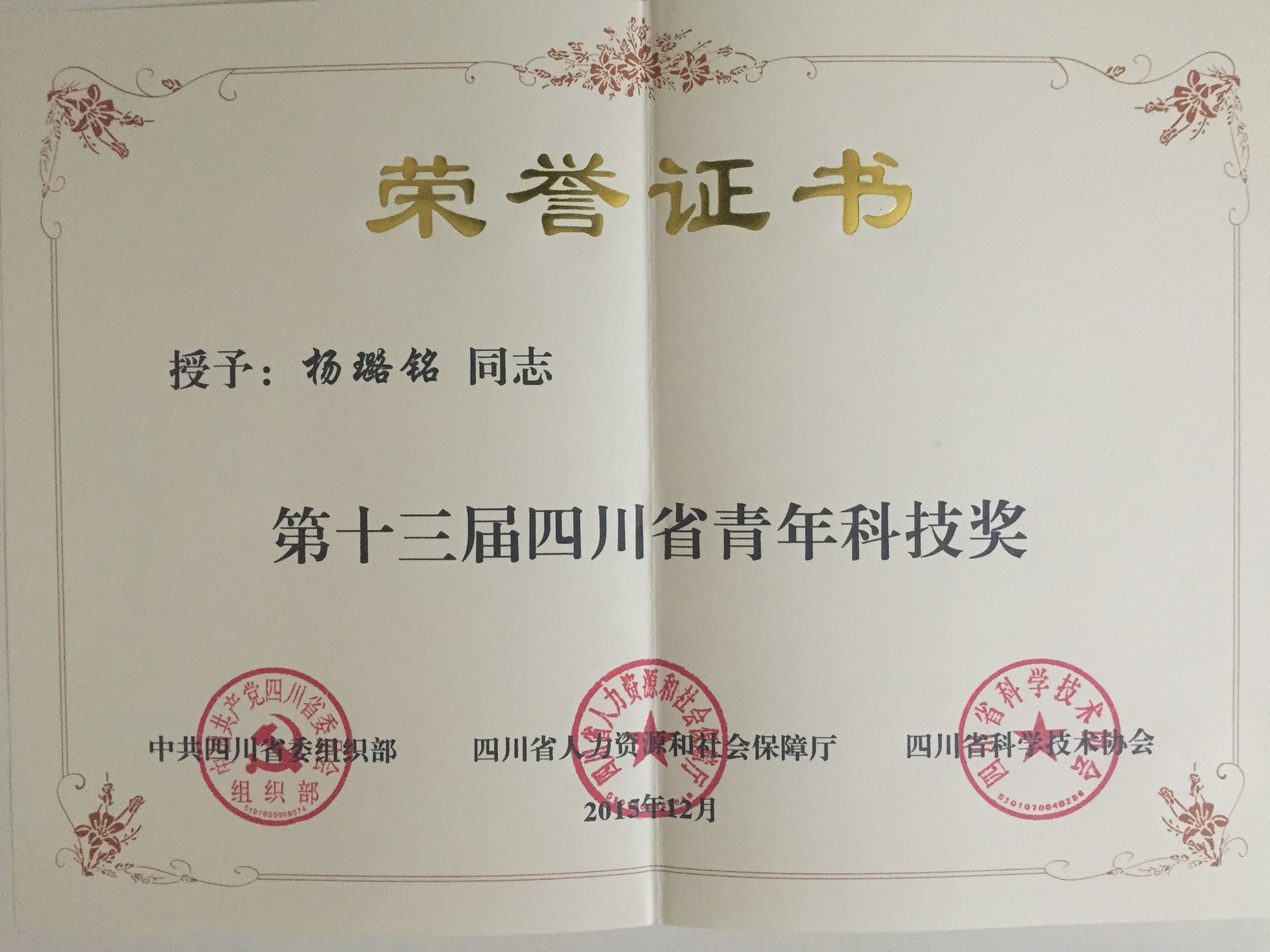 副教授杨璐铭博士获此殊荣。四川省青年科技奖是由中共四川省委组织部、四川省人力资源和社会保障厅、四川省科学技术协会共同发起,第十三届四川省青年科技奖推荐工作于2015年6月下旬正式启动,各市(州)组织部、人社局、科协,各省级部门,各省级学会、协会、研究会在内的单位共推荐了申报第十三届省青年科技奖候选人175名。四川省青年科技奖领导小组办公室根据《关于开展第十三届四川省青年科技奖评选表彰工作的通知》要求,对所有申报材料进行了资格审查,并按照理学、工学、农林医药卫生、综合等学科类别进行分组,由评委进行了初评、复评,最后在全体评委会议上进行充分评议,并以无记名投票的方式评选产生50名第十三届四川省青年科技奖入选者。