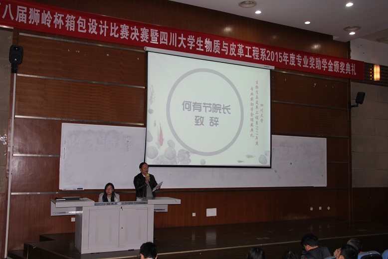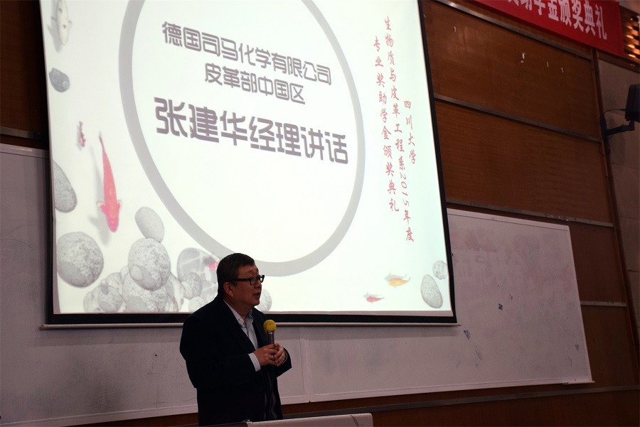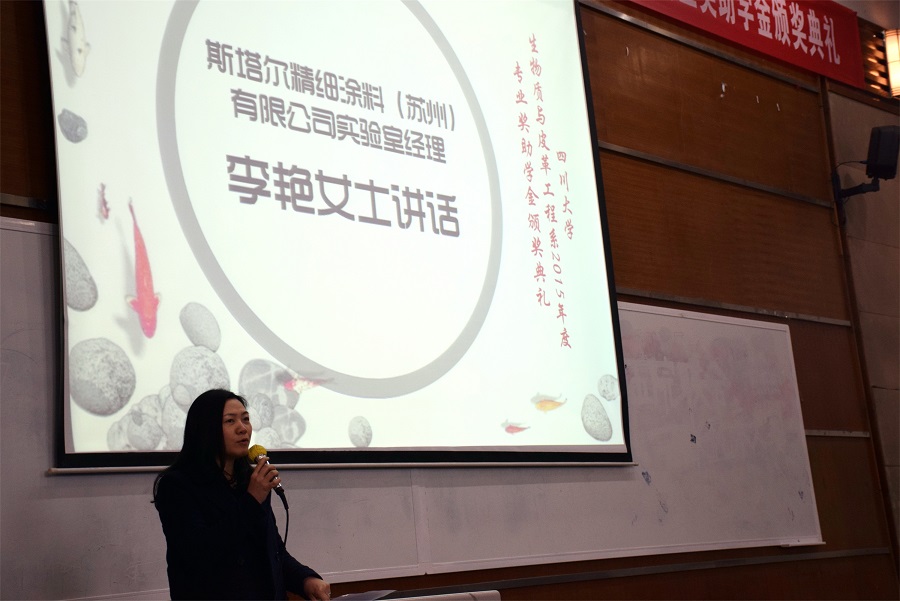 及生物质与皮革工程系感谢设奖单位、个人及专程到成都参加颁奖典礼的设奖单位嘉宾,感谢他们对皮革高等教育的关心与支持,感谢他们对川大学子的支助与鼓励,也对获奖同学表达了衷心的祝贺。同时,何院长也向各位嘉宾介绍了四川大学生物质与皮革工程近年来在教学、科研、人才培养等方面所取得的成绩。紧接着,设奖单位代表中国皮革协会陈占光秘书长,德国司马化学有限公司皮革部中国区张建华经理,斯塔尔精细涂料(苏州)有限公司实验室经理李艳女士分别进行了简短讲话。设奖单位代表均纷纷表示,希望通过奖学金的设立加强与高校在人才培养、技术交流等方面进行更深入的合作。随后,四川大学8bo足球比分