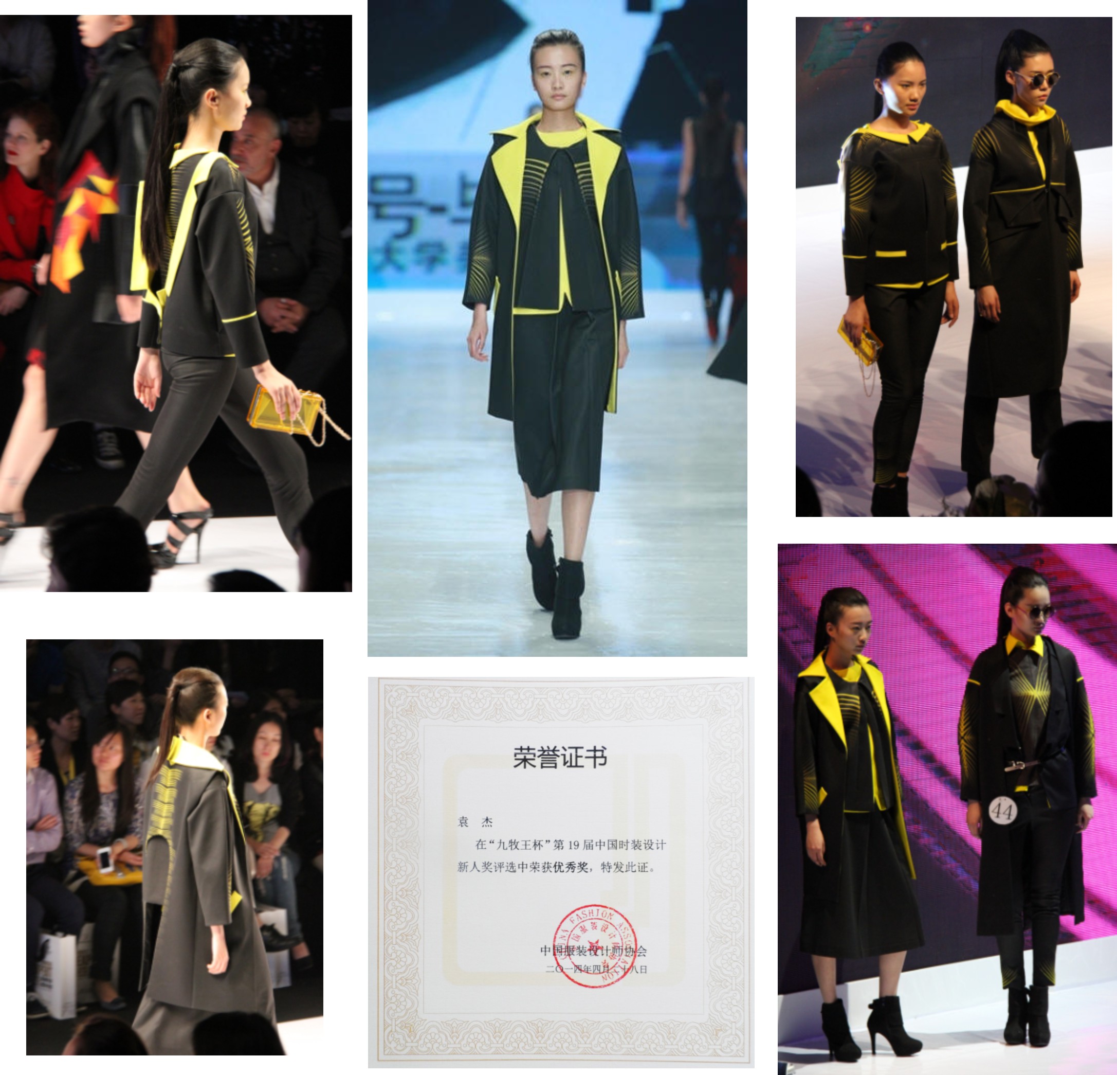 2011级服装与服饰设计专业生袁杰同学在这次比赛中荣获“九牧王杯”第19届中国时装设计新人奖优秀奖(16名),其指导老师为冯洁和吴晶。