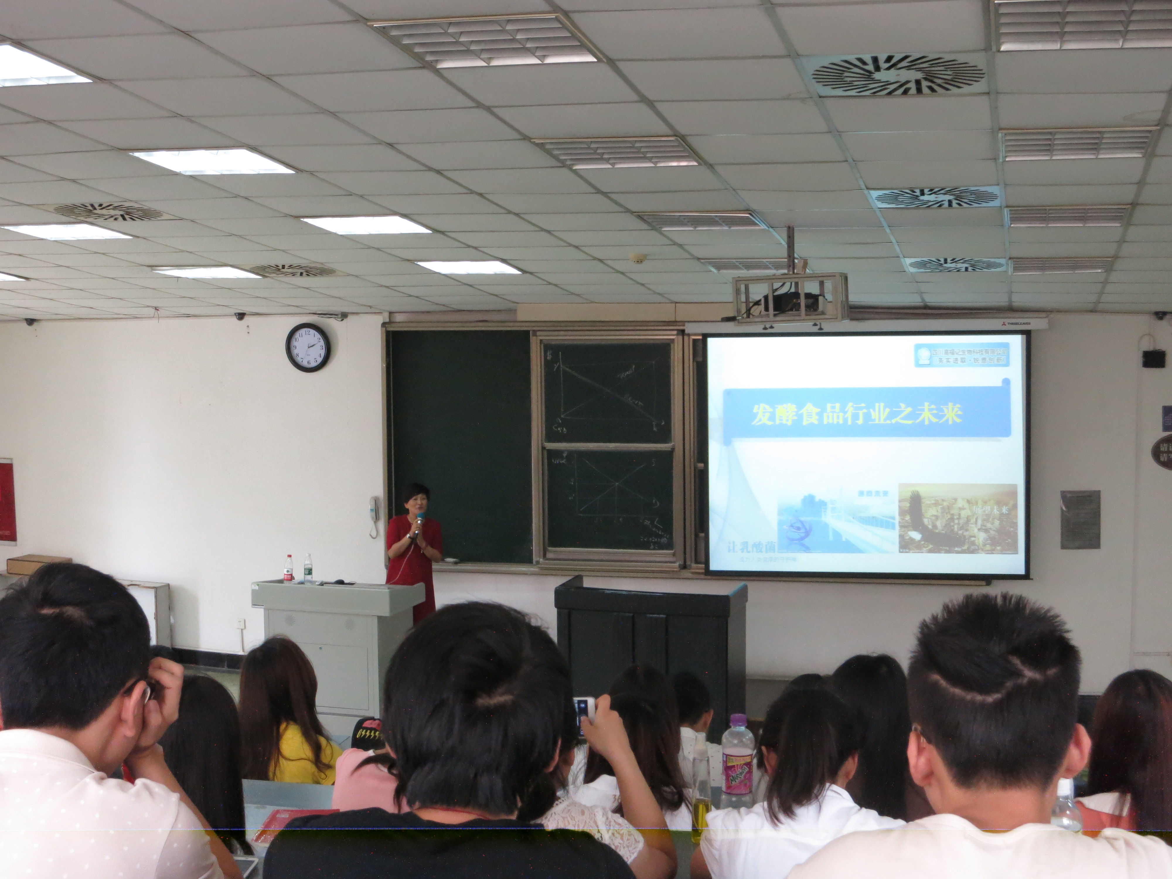 贾利蓉副教授主持了本次讲座。 下午两点整,讲座正式拉开序幕。首先,贾利蓉副教授为大家隆重介绍了本次讲座的主讲嘉宾高银江董事长。在同学们的热烈掌声中,高银江董事长走上讲台,以酱腌菜也就是我们俗称的泡菜为例,就中国发酵行业以及食品行业的现状及问题做了具体的分析。高董事长表示,传统的酱腌菜发酵过程中产生的毒素、所加入的食品添加剂以及制作过程的不规范化,让酱腌菜在国外饱受争议,甚至被列入了垃圾食品的行列。作为一名中国人,自己传统的食品在社会上不受认可的现实,让高董事长深感惋惜,并也因此鞭策着自己要研制出一种对人体健康、对环境可持续的中国传统食品发展的道路。讲座过程中,高董事长不断激励、启发在场同学用自己所学为中国食品行业的未来作出应有的贡献。并且以稻盛和夫定律:人生成果=价值观(55%)+激情(30%)+能力(15%)来告诉大家,树立正确的价值观,用自己持之以恒的激情来创造自己的成功。最后,现场同学积极地就自己学习过程中的问题以及对食品专业的前景问题与高银江董事长进行了探讨,讲座在热烈的气氛中圆满结束。 作为成都市人大代表、中国发酵行业的领头人,高银江董事长以她强烈的社会责任感、不断求索的创新精神,赢得了在场同学钦佩。通过这次讲座,也让在场同学对自己的行业前景有了更深的了解,对自己肩上的责任、对自己未来的使命有了更明确的认知。