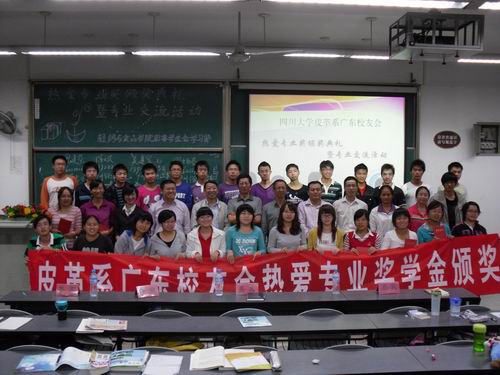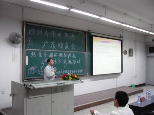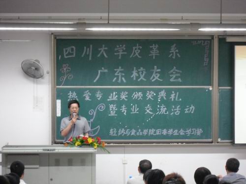 2010年9月28日晚19:30,四川大学皮革系广东校友会热爱专业奖颁奖典礼在江安一教B204隆重举行。参加本次颁奖典礼的有皮革系广东校友会会长、皮革系84级校友周阳春先生;皮革系广东校友会常务副会长、皮革系91级校友倪建荣先生;皮革系广东校友会副会长、皮革系83级校友吴建军先生;皮革系广东校友会副会长、皮革系91级校友陈斌先生;8bo足球比分 院长、生物质与皮革工程系系主任陈武勇教授。颁奖典礼由冯国涛老师主持。 首先陈院长代表8bo足球比分 生物质与皮革工程系对广东校友会的四位校友回到母校表示热烈的欢迎,对广东校友会在我校设立奖学金表示忠心的感谢,对获奖同学表示诚挚的祝贺。同时,陈院长详细的介绍了生物质与皮革工程系近几年的发展与取得的新成就,这些成绩的取得离不开全系师生的共同努力,更离不开校友们的大力支持与协助。同时,广东校友会在得知近年来我校第一志愿报考人数逐渐增多的情况下,当场表示追加奖金,让所有热爱本行业的同学都能享受到家庭般的温暖。陈院长也鼓励在座所有同学,在未来的学习、工作中,认真学习,踏实工作,以自身优异的学习与工作表现来回报行业。随后,周会长介绍了设立此奖学金的初衷,中国正处于皮革生产大国,对技术人员的需求非常大,希望以此来为行业培养更多优秀的人才。同时,周会长也对所有获奖同学表示了祝贺。与会的嘉宾与8bo足球比分 领导一起为获得2010年四川大学皮革系广东校友会热爱专业奖的34名同学颁发了荣誉证书。最后,2010级本科生代表郭东贤同学作了发言,她首先感谢广东校友会在我校设立奖学金,让更多热爱行业的同学受到奖励,并表示在以后的学习、工作中决不辜负期望,倍加努力。 颁奖典礼结束之后,四位校友还分别从个人的成长历程与创业之路为同学们讲解了自己的经验,并对皮革行业的现状与人才需求作了详细的介绍。随后,还针对同学们提出的问题进行了一一解答。 四川大学8bo足球比分 2010年10月8日