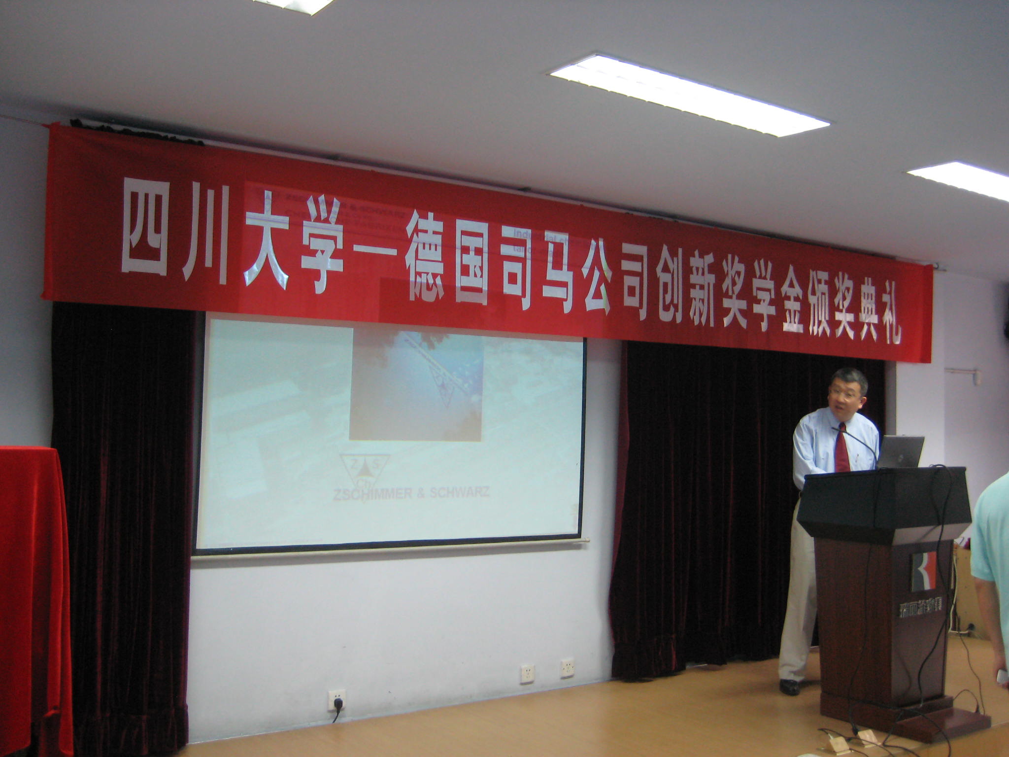 建立了良好的合作关系。2008年司马化学有限公司在四川大学设立了“四川大学—德国司马创新奖学金”,这个奖学金是行业、企业首次为四川大学大三大四本科生进行科研创新实践而设立的。此次张总一行到我校还有的重要工作是对获得第二批创新奖学金资助项目进行中期检查。随后,张建华经理代表司马公司对本次获得奖学金的同学表示祝贺,并勉励大家以此为新的起点,争取明年取得更加优异的成绩。
