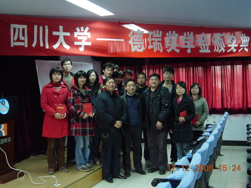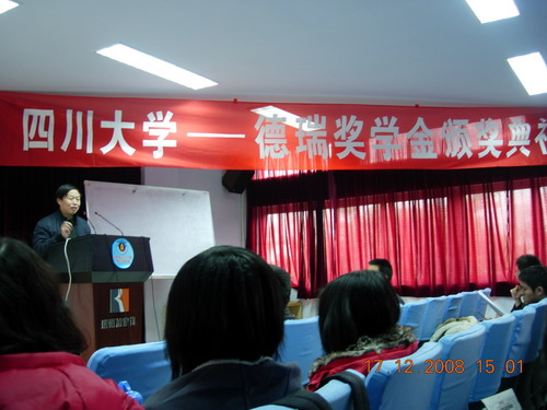 致辞,对德瑞皮革科技有限公司长期以来对四川大学的支持与关注,在我校设立奖学金表示衷心的感谢,对我校杰出校友能在百忙之中回到母校表示热烈的欢迎,并期望与同学们有深入细致的交流。随后,姚兵先生代表德瑞皮革科技有限公司对本次获得奖学金的同学表示祝贺,并勉励大家以此为新的起点,争取明年取得更加优异的成绩。刘晓虎副教授宣布了获奖名单,并与姚兵先生、何院长一起为优秀研究生、优秀本科生、优秀专科生同学颁发了证书。最后,获奖同学代表2005级轻化工程专业顾庆圆同学作了发言,他首先是对设奖单位表示感谢,并表示在以后的学习中,定将倍加努力,不辜负老师、企业的一片期望。颁奖典礼结束后,姚兵先生还与同学进行了深入的交流与互动,就同学们所关心的金融危机对行业的影响,职业生涯规划以及女同学就业等问题进行了细致的交流,并获得了同学们的阵阵掌声。(billows)生物质与皮革工程系2008年12月17日