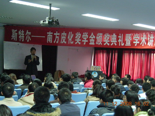 2008年12月11日下午14:00,斯特尔—南方皮化奖助学金颁奖典礼及学术讲座皮革楼二楼报告厅隆重举行。参加本次颁奖典礼的嘉宾有Stahl公司欧洲总部涂饰部门经理Peter教授;Stahl公司亚洲水场及染粉部技术经理李教授;Stahl公司华南区涂饰部销售经理谭子夜先生;Stahl公司涂饰部技术、98级皮革系校友涂刚先生;以及生物质与皮革工程系副系主任张宗才教授,王坤余教授。 颁奖典礼在一片欢呼声中举行,Peter教授首先致辞,表示了对获奖同学的祝贺,并希望他们再接再励,争取更加优异的成绩。接下来Stahl公司为我们进行了长达4小时的学术讲座,现场座无虚席,同学们踊跃提问,让讲座气愤相当热烈。讲座分为两个部分进行,首先是由Peter教授为同学们作喷涂方面的知识讲座,1个小时的讲解结束后,还带领同学们到资料室现场参加、亲自感受了由Stahl公司专门从欧洲带过来的100多张皮革样品,各种风格、不同种类的皮革样品让同学们眼花缭乱,也深深体会到了皮革喷涂的艺术性与高雅性。接下来由李教授为同学们做了水场方面的讲座,李教授深入浅出,讲解细致,让同学们对水场的操作有了全面的了解与更深的体会。讲座结束以后,Stahl公司还为参会同学赠送了精美的礼品。本次学术讲座的成功举办,相信让同学们大开眼界,对书本的理论知识有了更深的理解,也对皮革行业多了一份热忱与期待。8bo足球比分