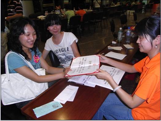 省慈善总会大厅工作人员在给同学们颁发慈善捐赠证