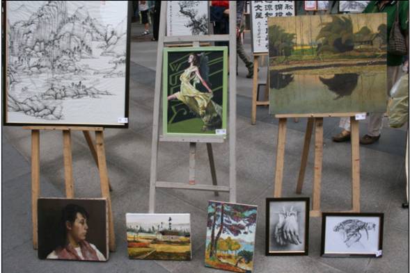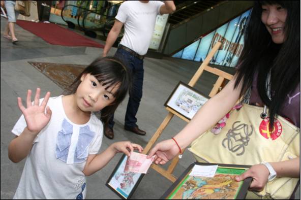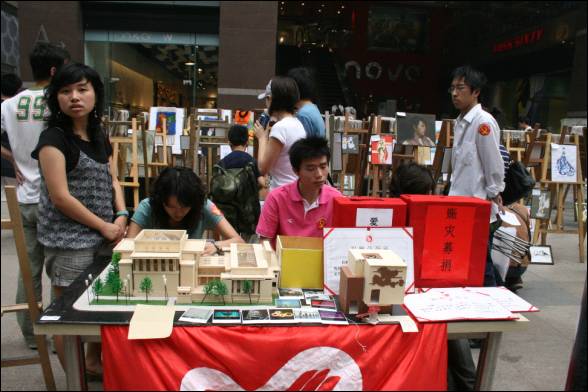 的同学们也非常踊跃地拿出平时珍藏的优秀作品,短短几个小时内就组织到265件作品。 师生们为本次义卖活动捐出了各类自己制作的艺术品,有油画、国画、服装效果图、素描、钢笔风景画、工艺挂毯、蜀锦、剪纸、建筑模型、手工坐椅板凳等。本次义卖活动既是同学们回报社会为灾区人民做贡献的爱心行动,也是一次生动的社会实践活动。把在编导课上学习的策划和组织方法,运用到现实中的实战策划与实现过程;同时在义卖活动中同学们学习观察到哪类作品,哪种风格的作品会受到市民的喜爱;在现场义卖中,同学热情的向市民介绍我们这次活动的背景意义,详细介绍作品的艺术性与工艺特点,踊现出具有良好口才的推销好手。在拍卖现场,同学们的服装效果图与工艺挂毯都取得了较好的拍卖效果,其中赵敏老师捐出的蜀绣作品拍得全场的最高价2008元。 本次义卖活动得到了校院的大力支持,院学生工作组为这次义卖活动出资1千5百多元用于绘画作品的装裱、画架作品运输。5月25日下午我校团委书记王斌老师与院党委刘晓虎副书记亲自来到作品拍卖现场为同学们加油鼓劲,王斌书记还现场购买了一幅学生绘制的服装效果图以示支持。这次义卖活动得到了全院同学的积极响应,作品现场组织与义卖管理虽然主要来自于服装设计与纺织工程专业师生,但轻化工程与食品专业的志愿者同学也相当热情,很多同学主动打来电话,愿意为本次义卖活动作志愿者,为灾区人民尽点力,做点事。 当全国人民为地震灾区慷慨解囊,纷纷无偿来到灾区做志愿者,告诉灾区人民:在这一刻,我们是四川人,我们是汶川人时,我们深受感动。我们川大与川师的学子,希望通过我们的努力代表四川高校的师生,告诉灾区的人民与学童: 不离弃,不放弃, 我们的心在一起,我们一直在支持你!